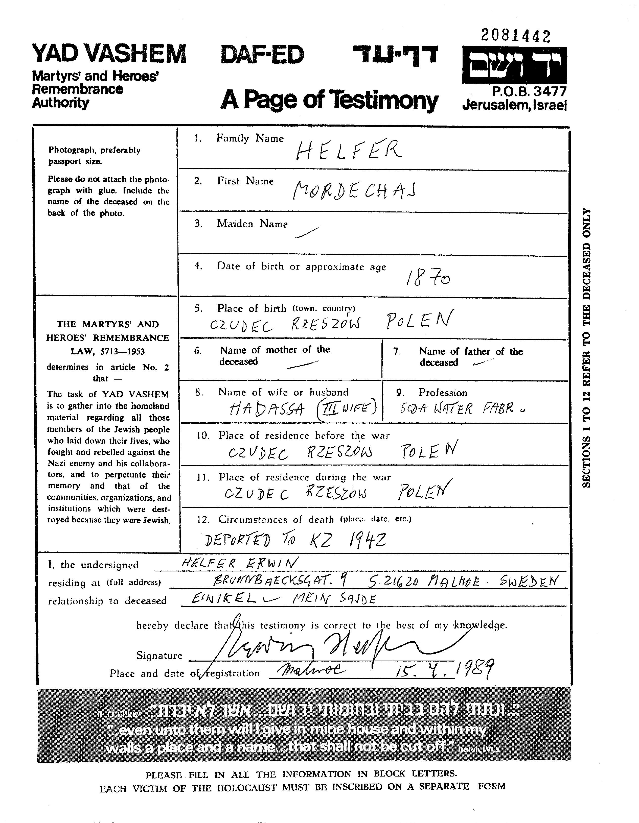 Helfer Halper Mordechaj 1870 Czudec, Pologne Feuille de témoignage