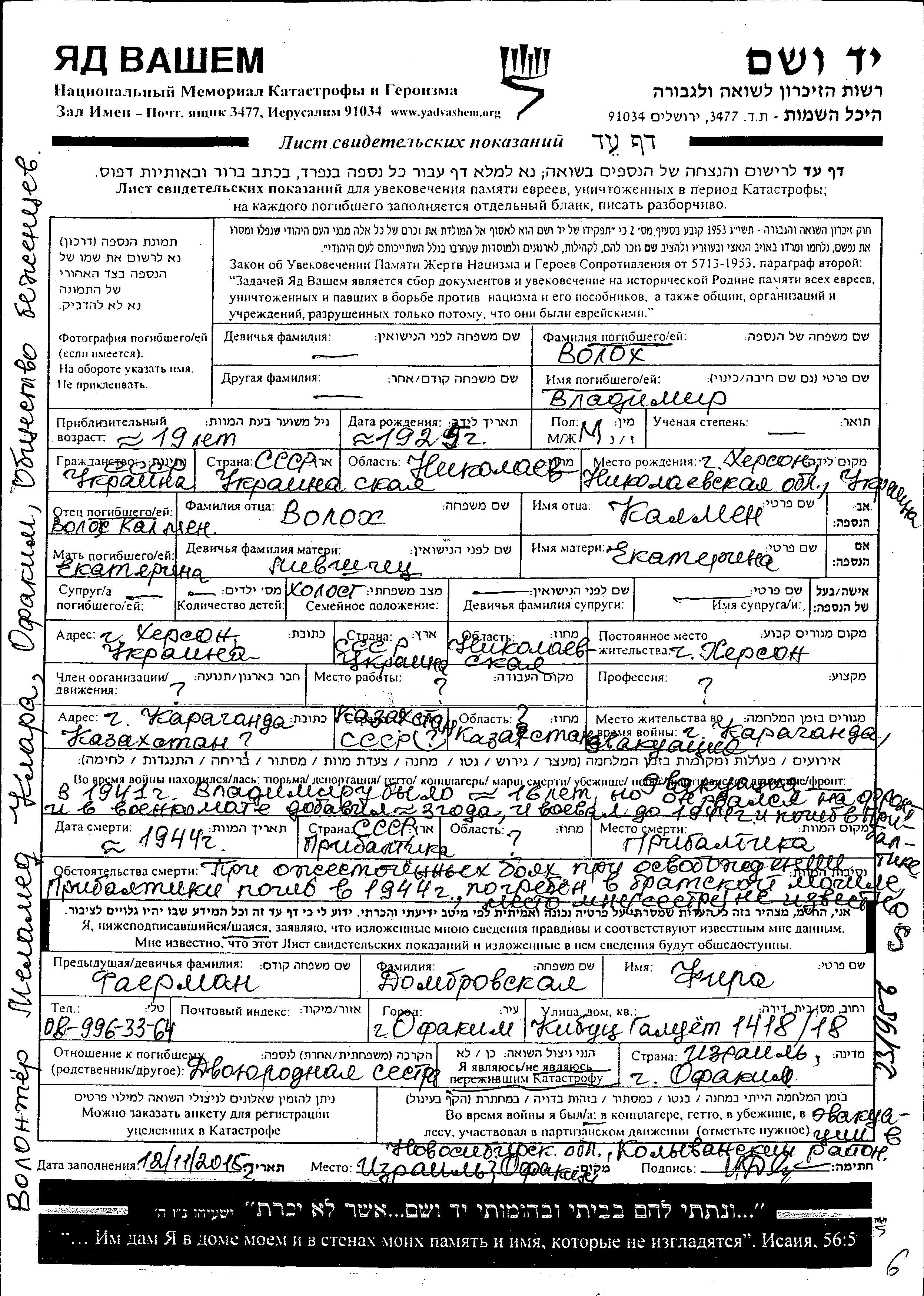 Volokh Vladimir 1929 Kherson, Ukraine (URSS) Feuille de témoignage