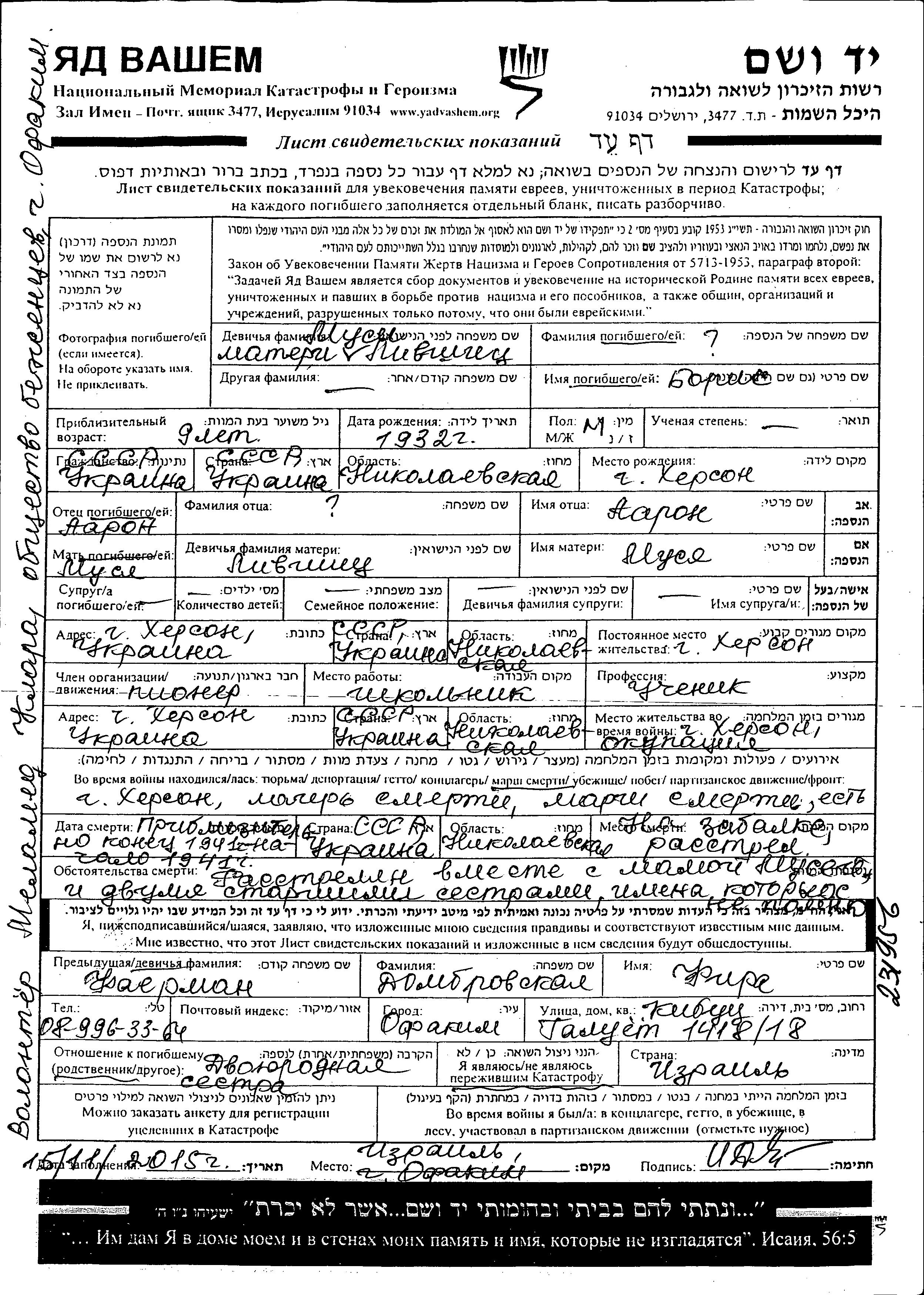 nom inconnu Boris 1932 Kherson, Ukraine (URSS) Feuille de témoignage