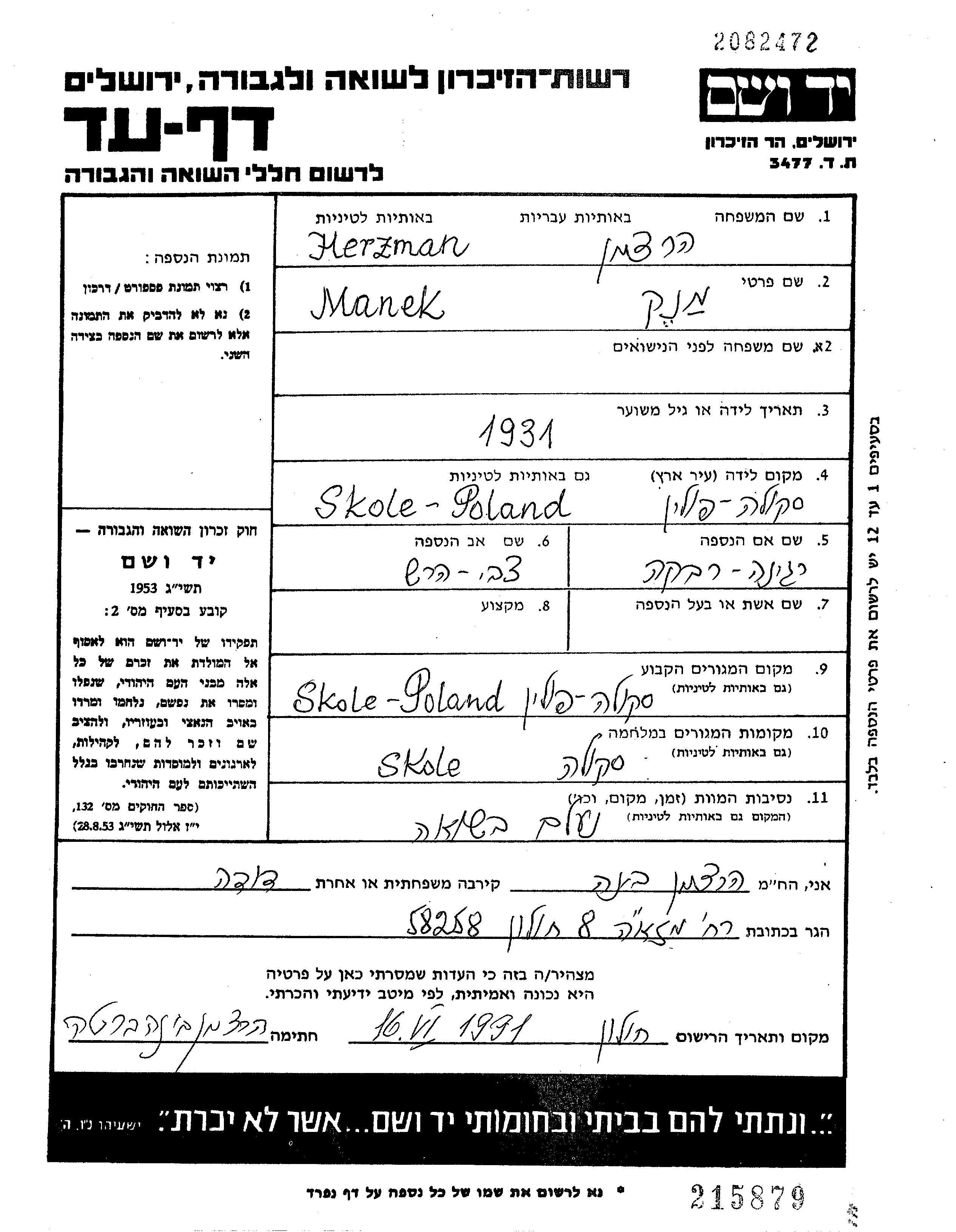 Manek Herzman est né à Skole, Pologne en 1931, fils de Tzwi Hersh et de Riwka Regina née Laufer. Il était Enfant. Avant la seconde guerre mondiale il vivait à Skole, Pologne. Au cours de la guerre, il était à Skole, Pologne.