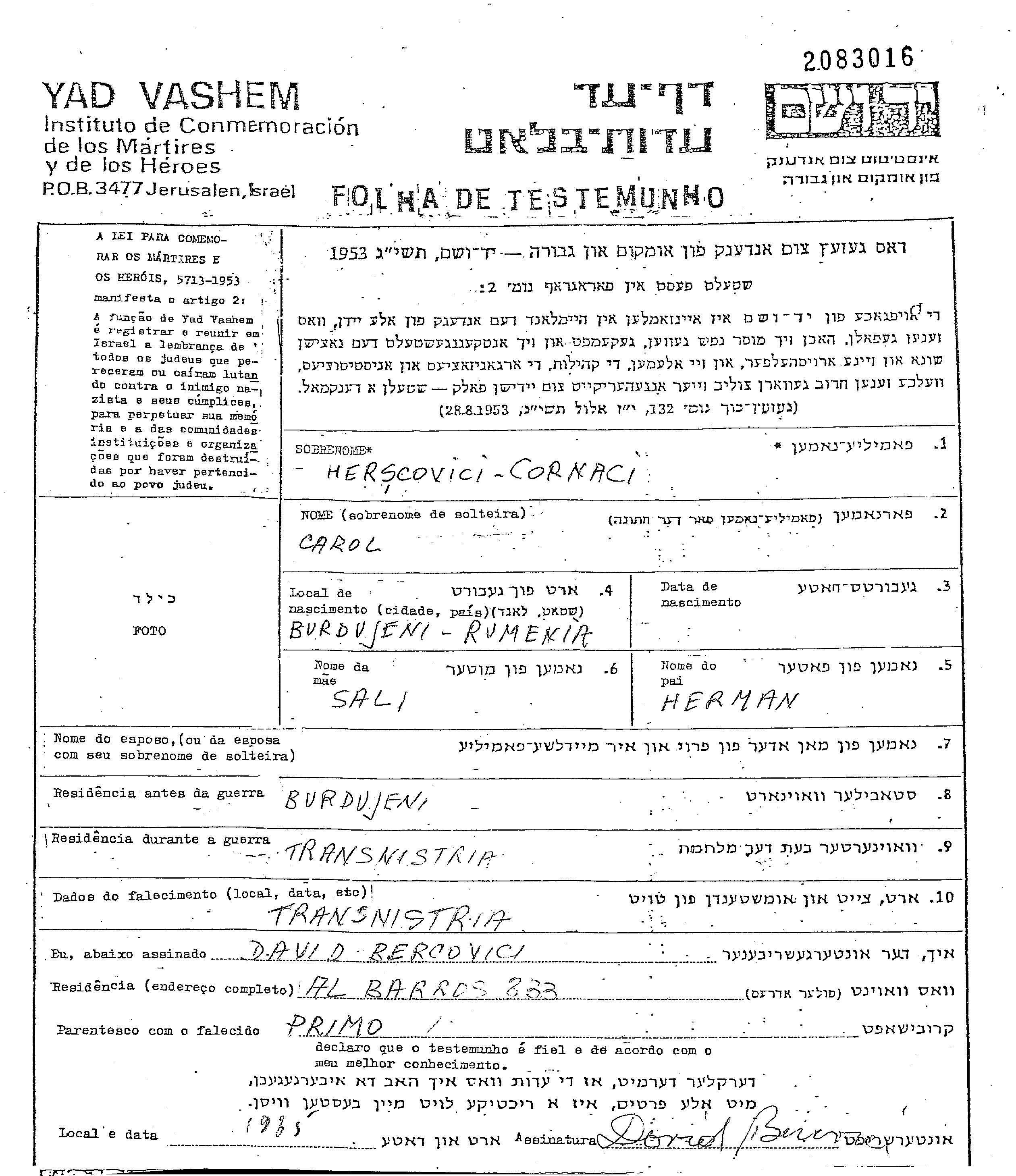 Herscovici Cornaci Korentz Carol Burdujeni, Roumanie Feuille de témoignage