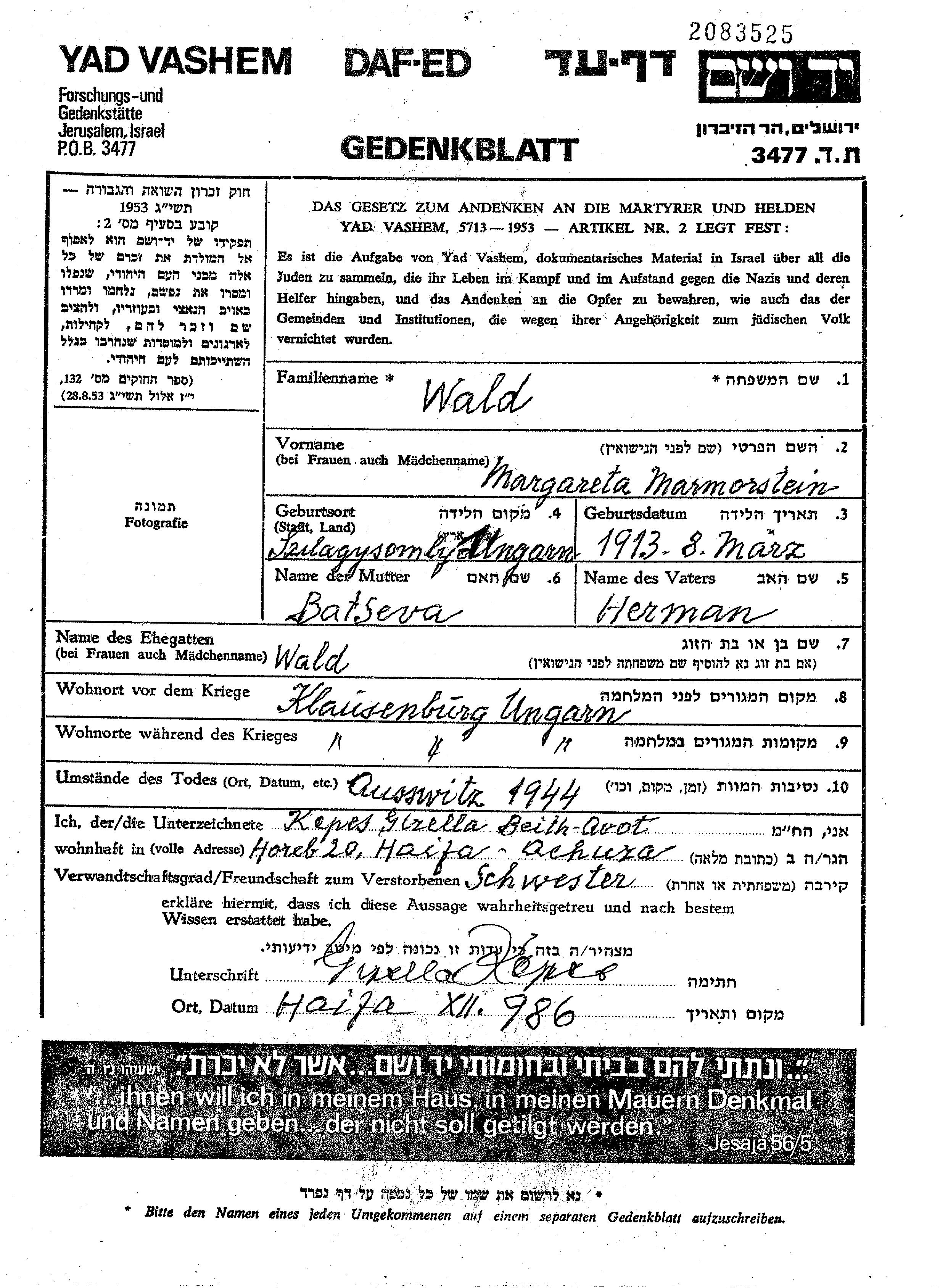 Margareta Wald née Marmorstein est née à Szilagysomlyo, Roumanie en 1913, fille de Herman et de Batseva. Elle était Mariée. Avant la seconde guerre mondiale elle vivait à Klausenburg, Roumanie. Pendant la guerre, elle était à Klausenburg, Roumanie.