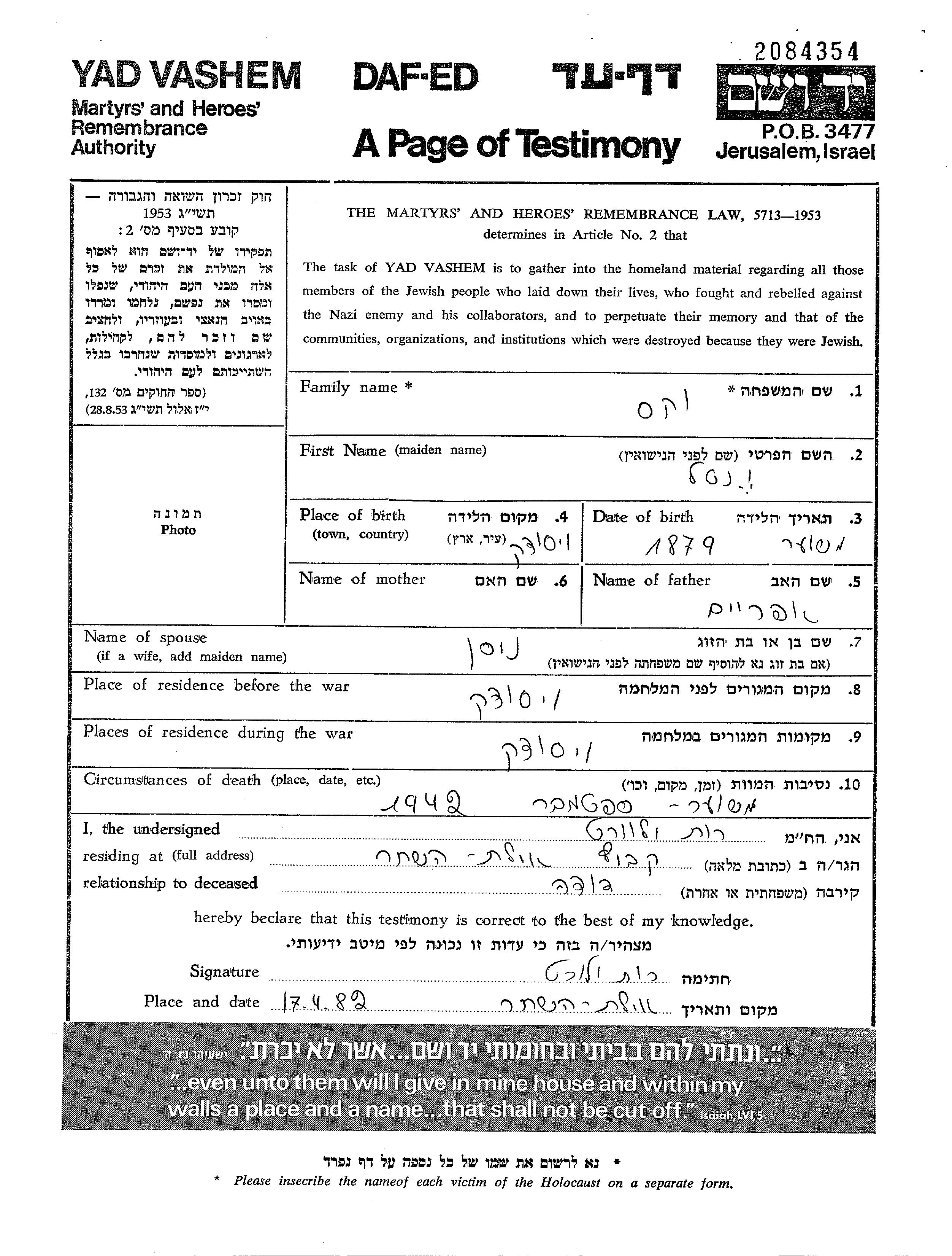Yad Vashem - Pages of Testimony Names Memorial Collection
