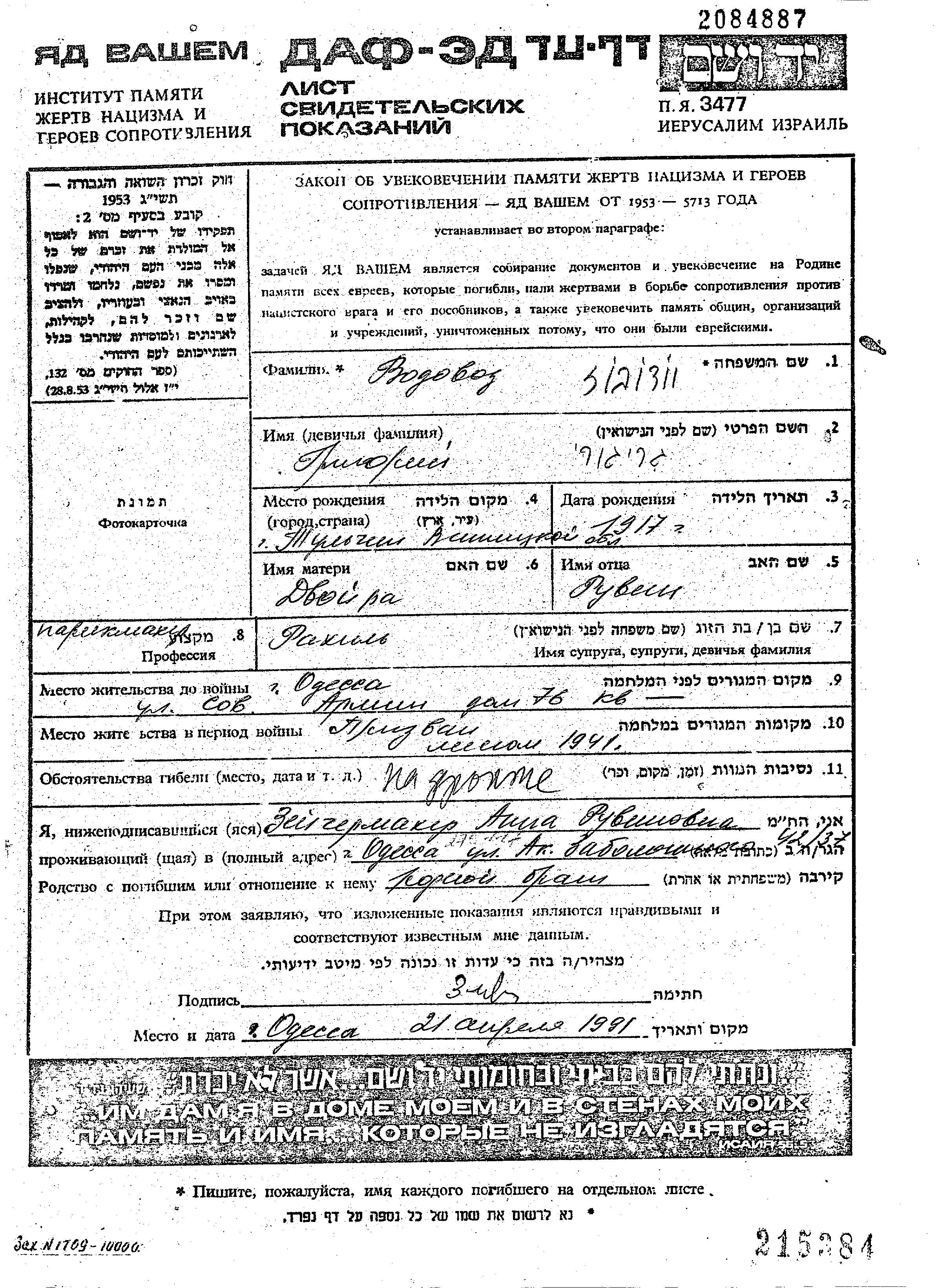 Grigori Vodovoz est né à Tulchin, Ukraine (URSS), fils de Ruvin et de Dvoira. Il était Coiffeur/coiffeuse et Mariée à Rakhil. Avant la seconde guerre mondiale il vivait à Odessa, Ukraine (URSS). Au cours de la guerre, il était à the Soviet armed forces. Grigori a été tué en tant que militaire pendant la Seconde Guerre mondiale.