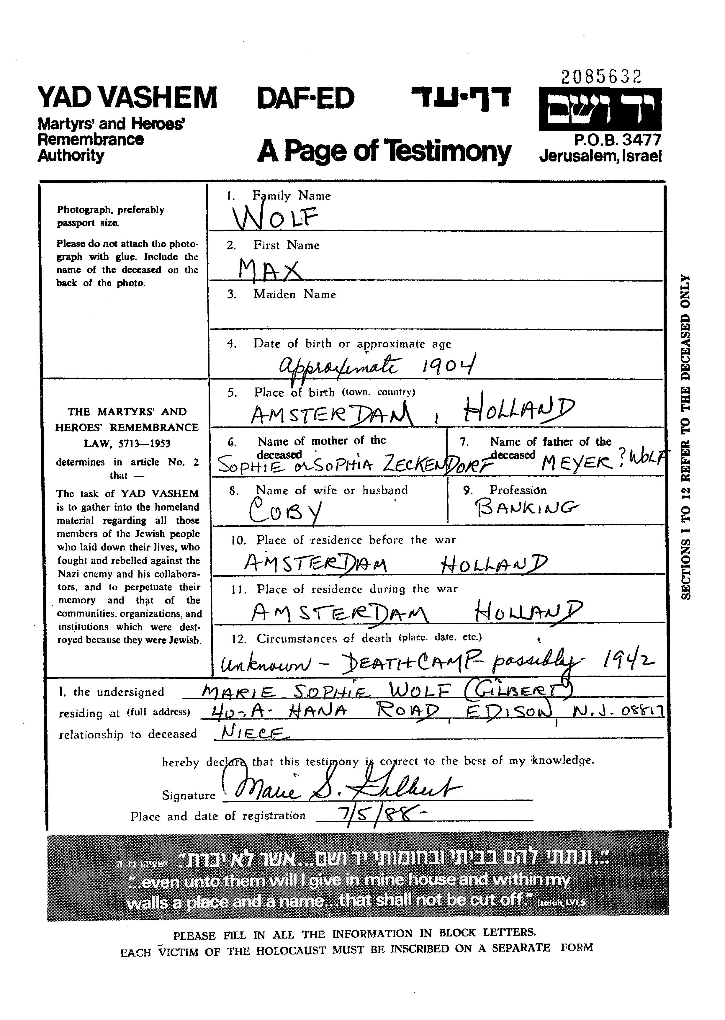 Max Wolf est né à Amsterdam, Pays-Bas, fils de Meyer et de Sophie née Zeckendorf. Il était Banquier et Mariée à Coby. Avant la seconde guerre mondiale il vivait à Amsterdam, Pays-Bas. Au cours de la guerre, il était à Amsterdam, Pays-Bas.