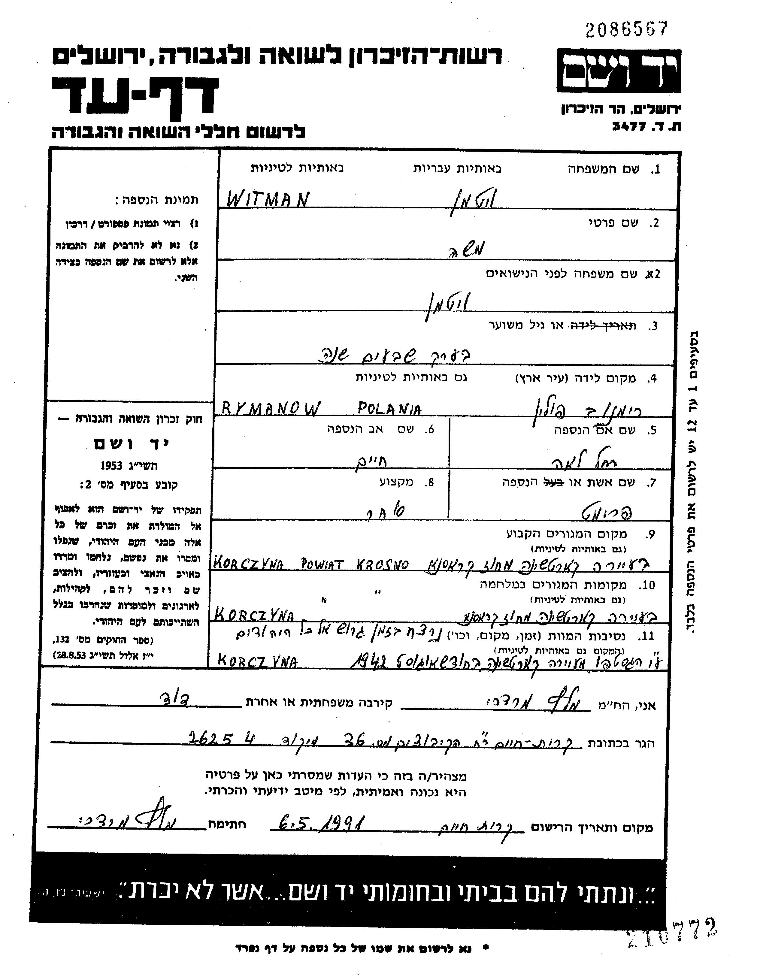 Witman Moshe 1872 Korczyna, Pologne Feuille de témoignage