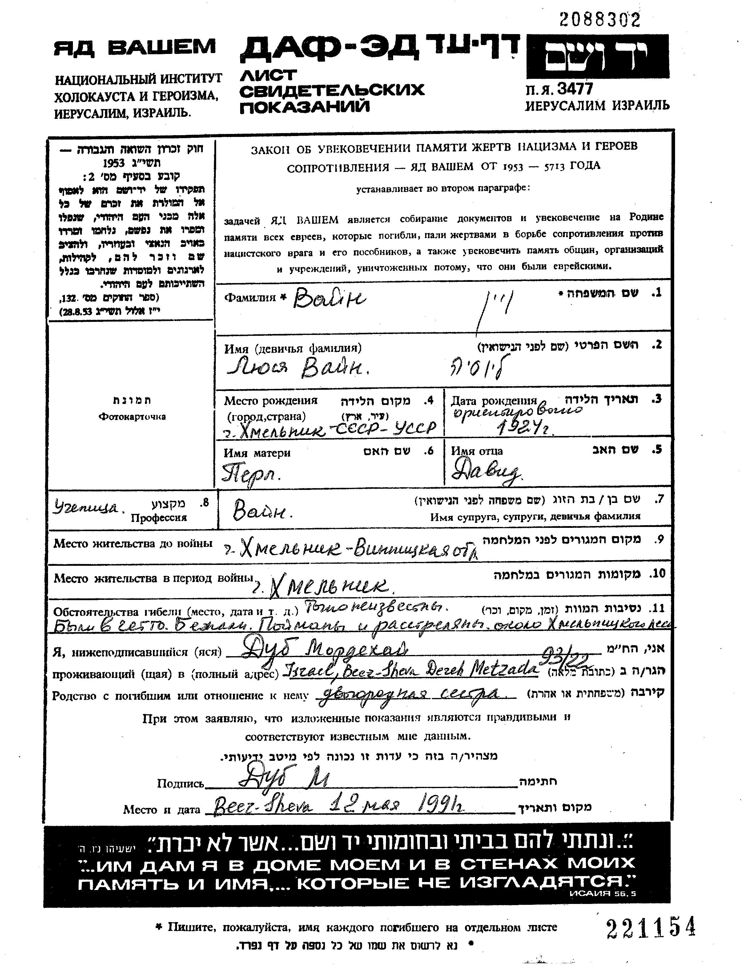 Vain Lyusya 1924 Khmelnik, Ukraine (URSS) Feuille de témoignage