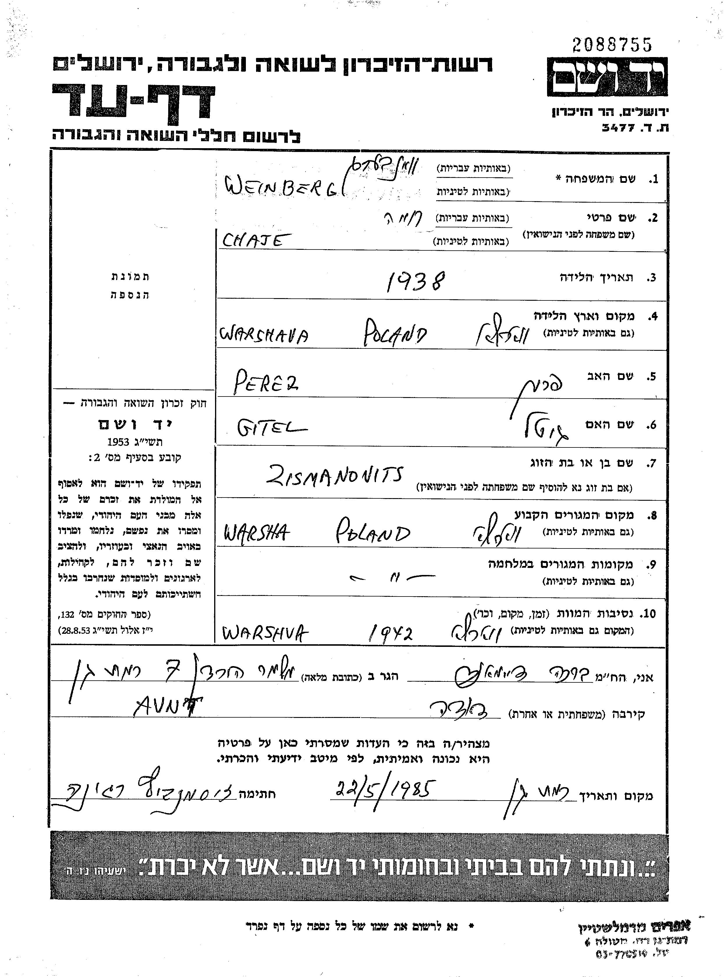 Weinberg Chaje 1938 Warszawa, Pologne Feuille de témoignage