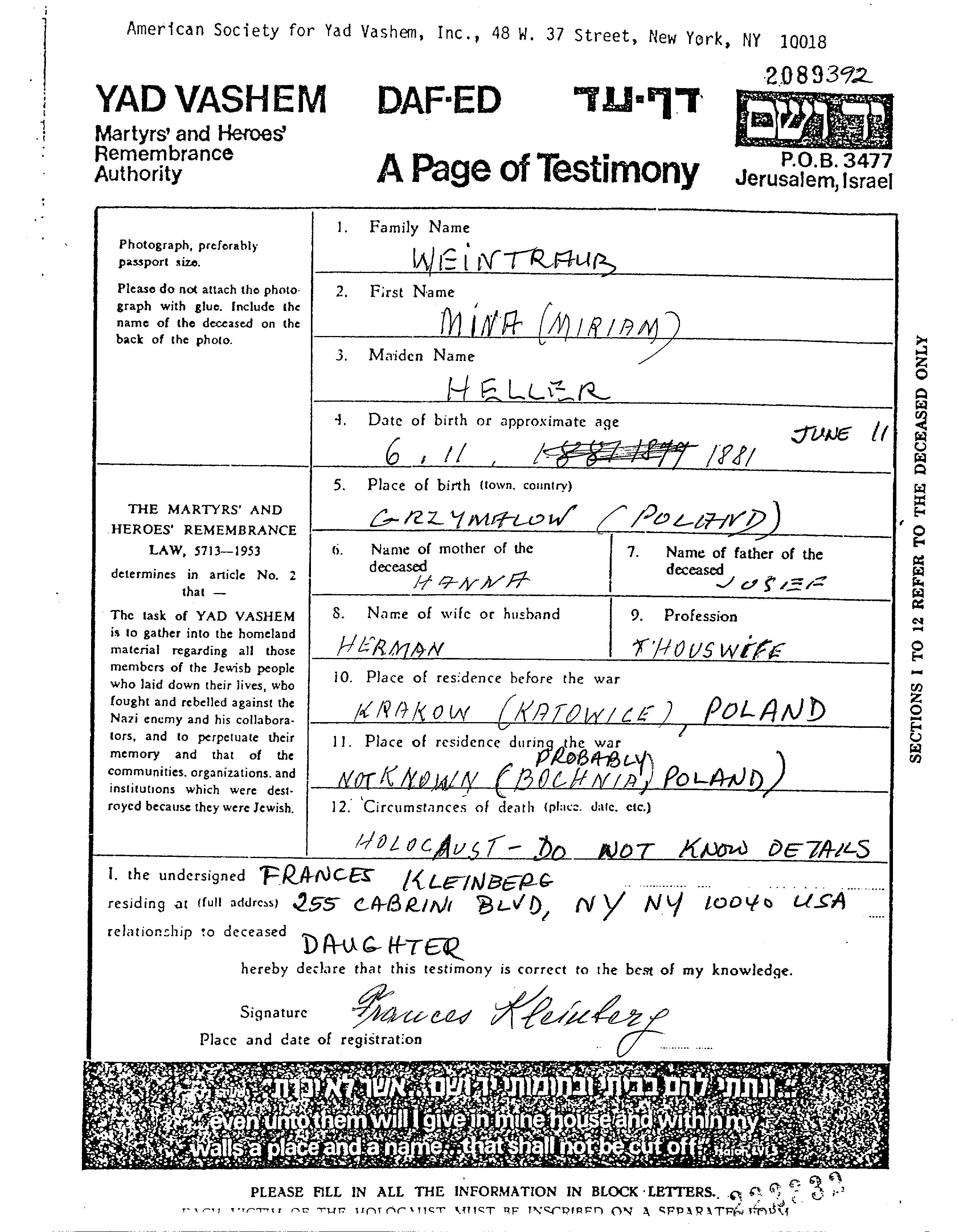 Miriam Mina Weintraub née Heller est née à Grzymałów, Pologne en 1881, fille de Jusef et de Hanna. Elle était Femme au foyer et Mariée à Herman. Avant la seconde guerre mondiale elle vivait à Krakow, Pologne. Pendant la guerre, elle était à Bochnia, Pologne.