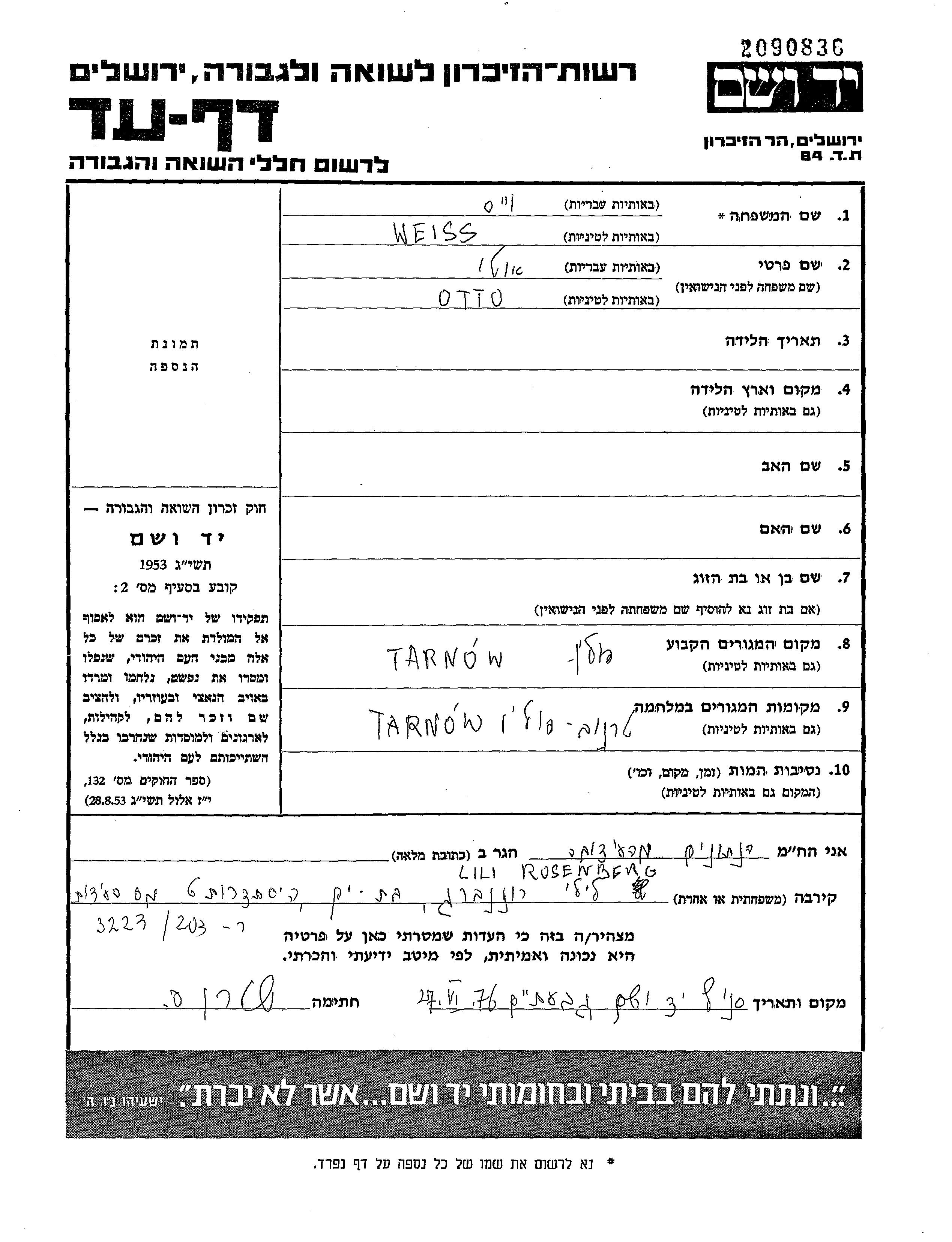 Otto Weiss. Avant la seconde guerre mondiale il vivait à Tarnow, Pologne. Au cours de la guerre, il était à Tarnow, Pologne.