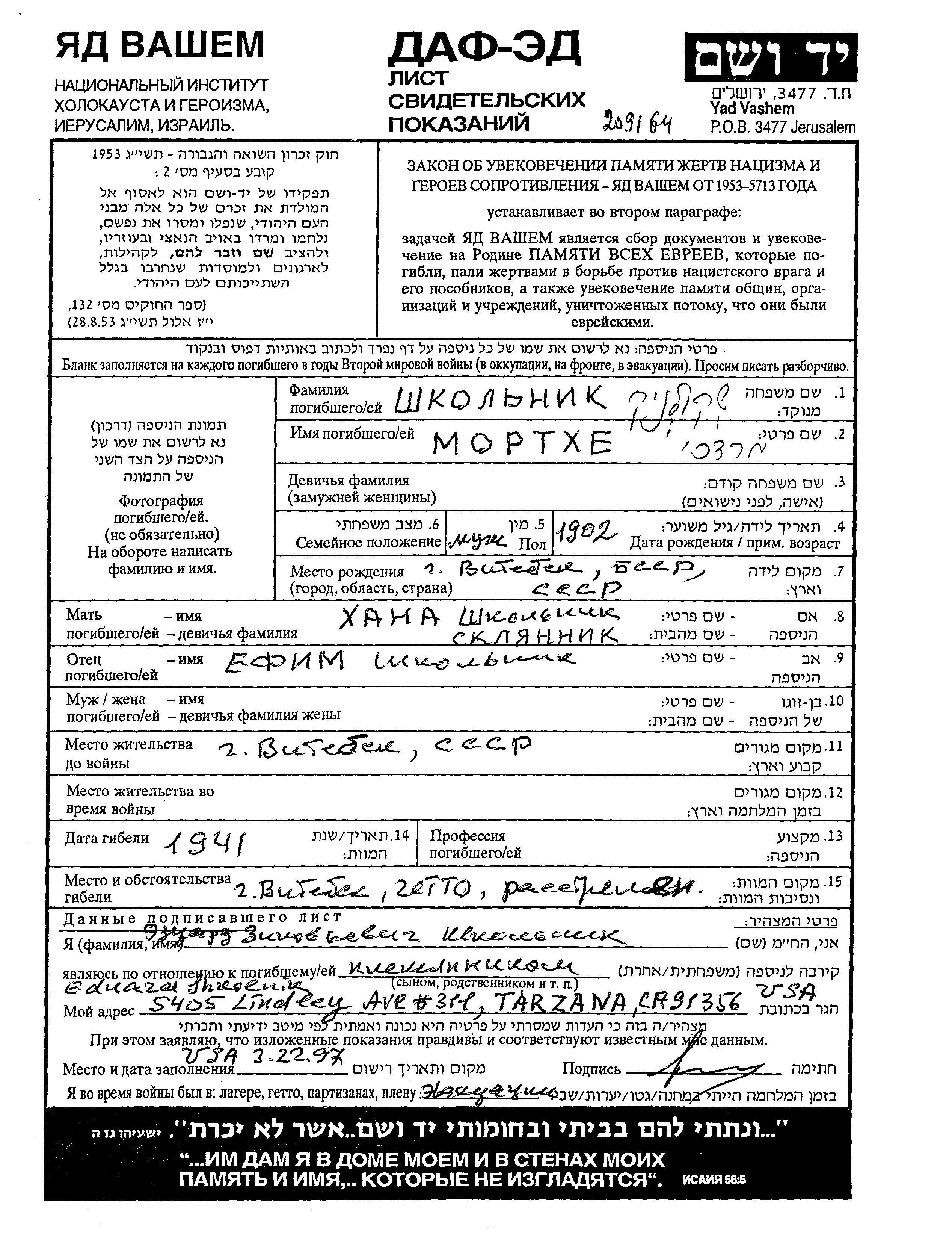 Shkolnik Mortkhe 1902 Vitebsk, Bélorussie (URSS) Feuille de témoignage