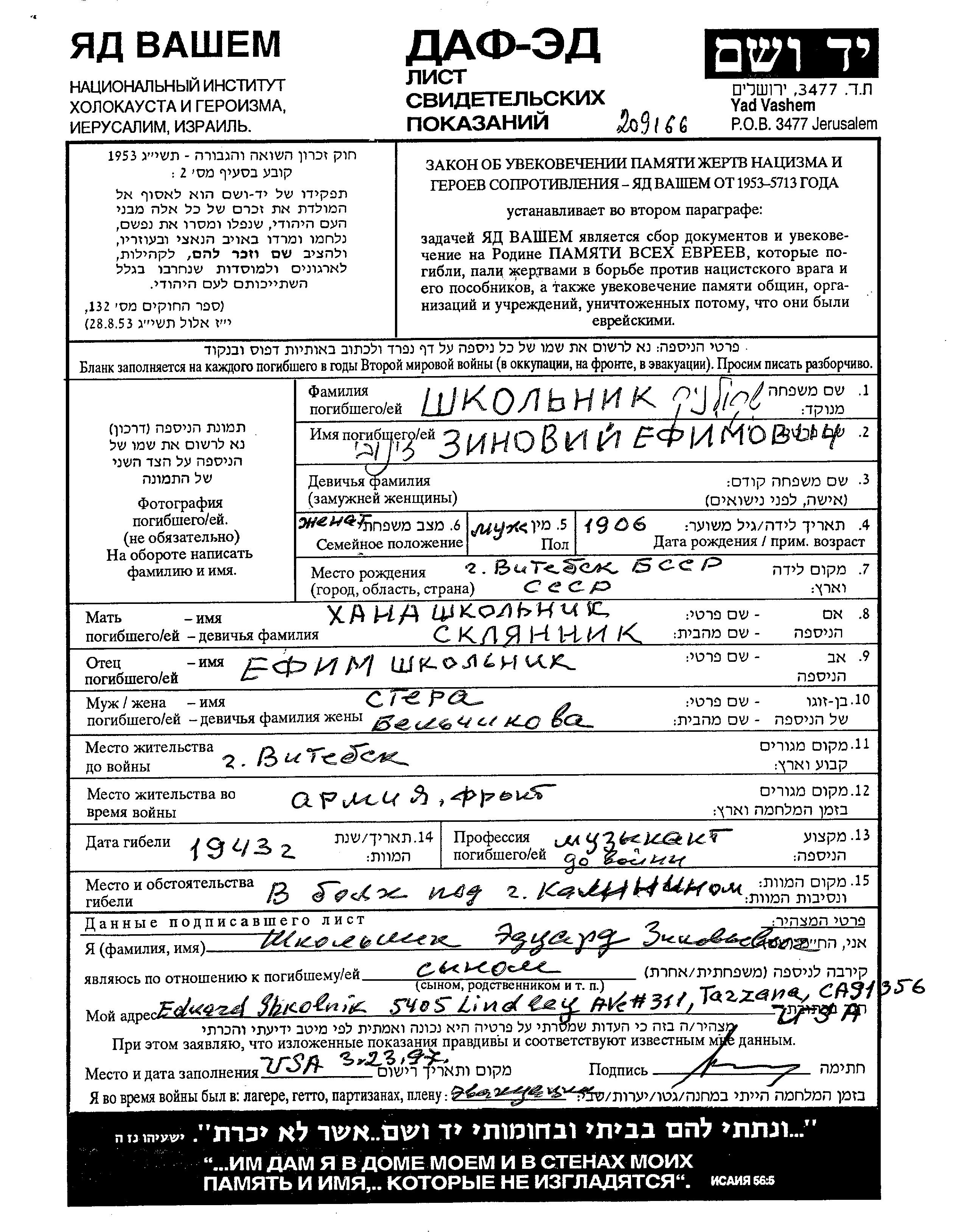 Shkolnik Zinovi 1906 Vitebsk, Bélorussie (URSS) Feuille de témoignage
