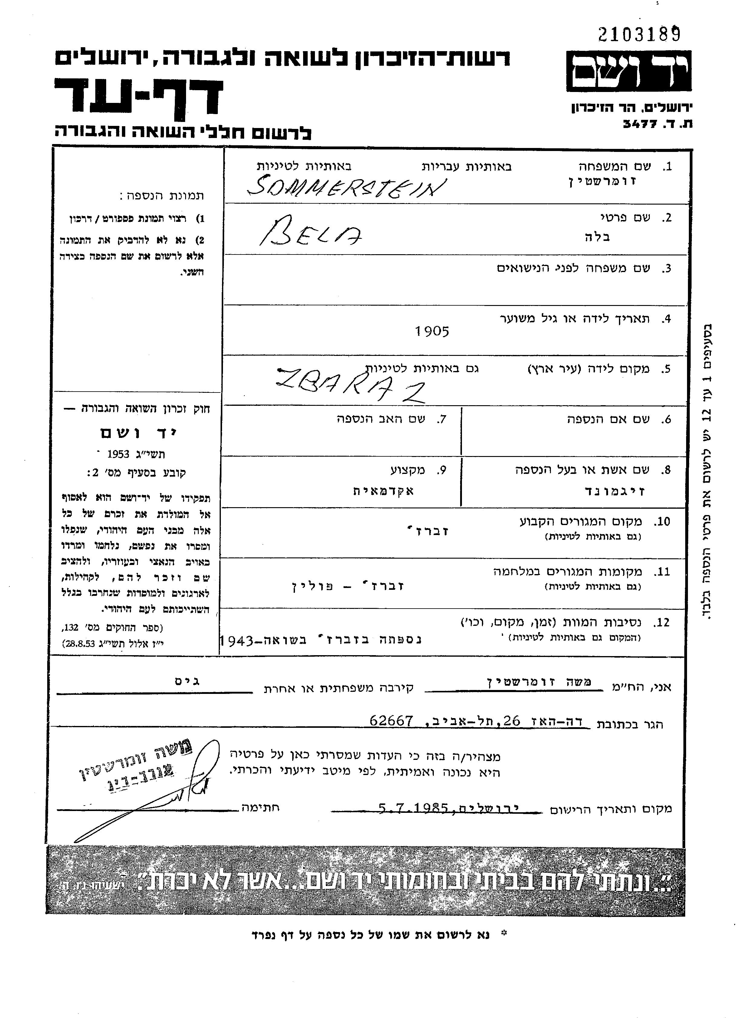 Sommerstein Bela 1905 Zbaraż, Pologne Feuille de témoignage