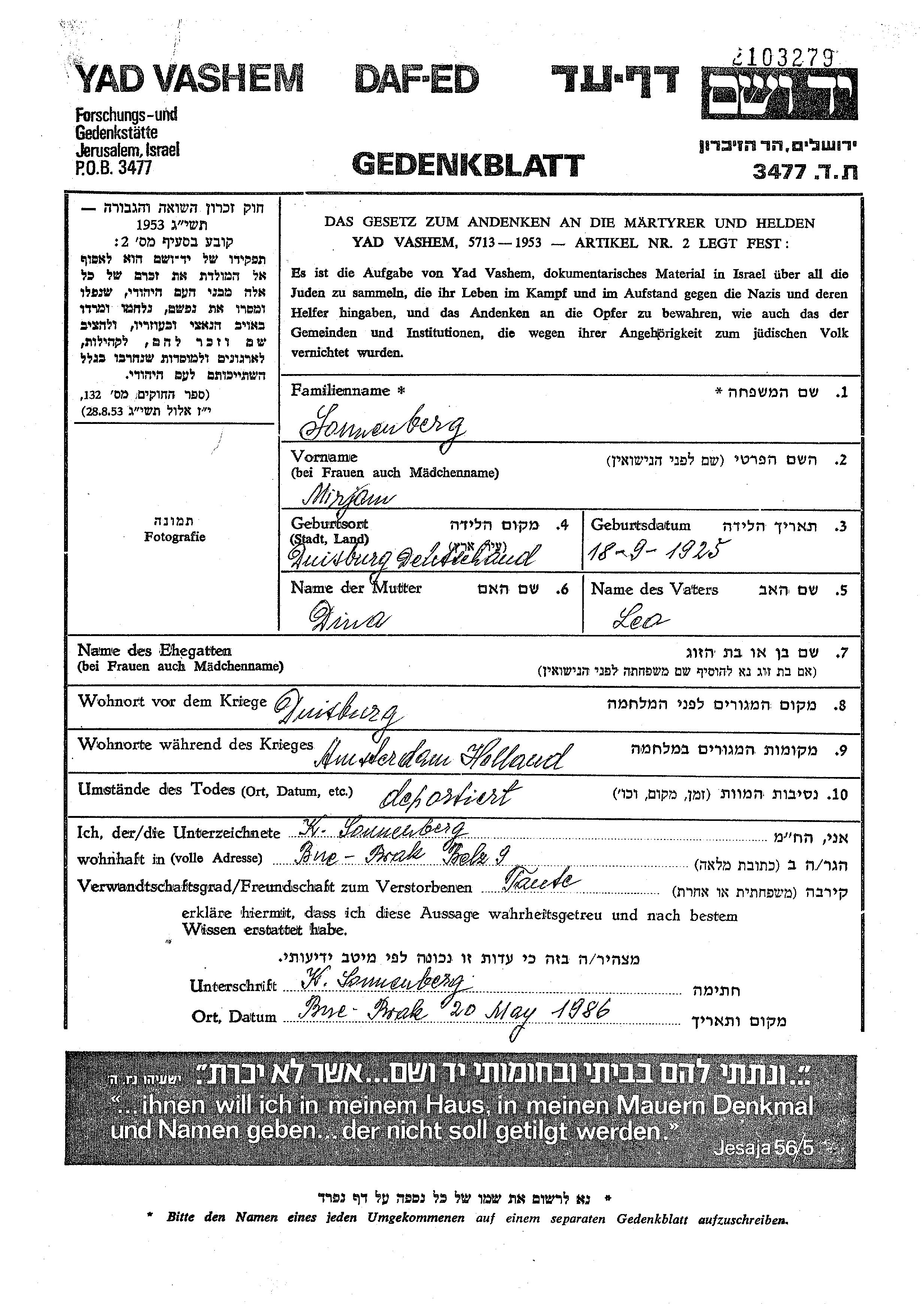 Sonnenberg Mirjam 1925 Duisburg, Allemagne Feuille de témoignage