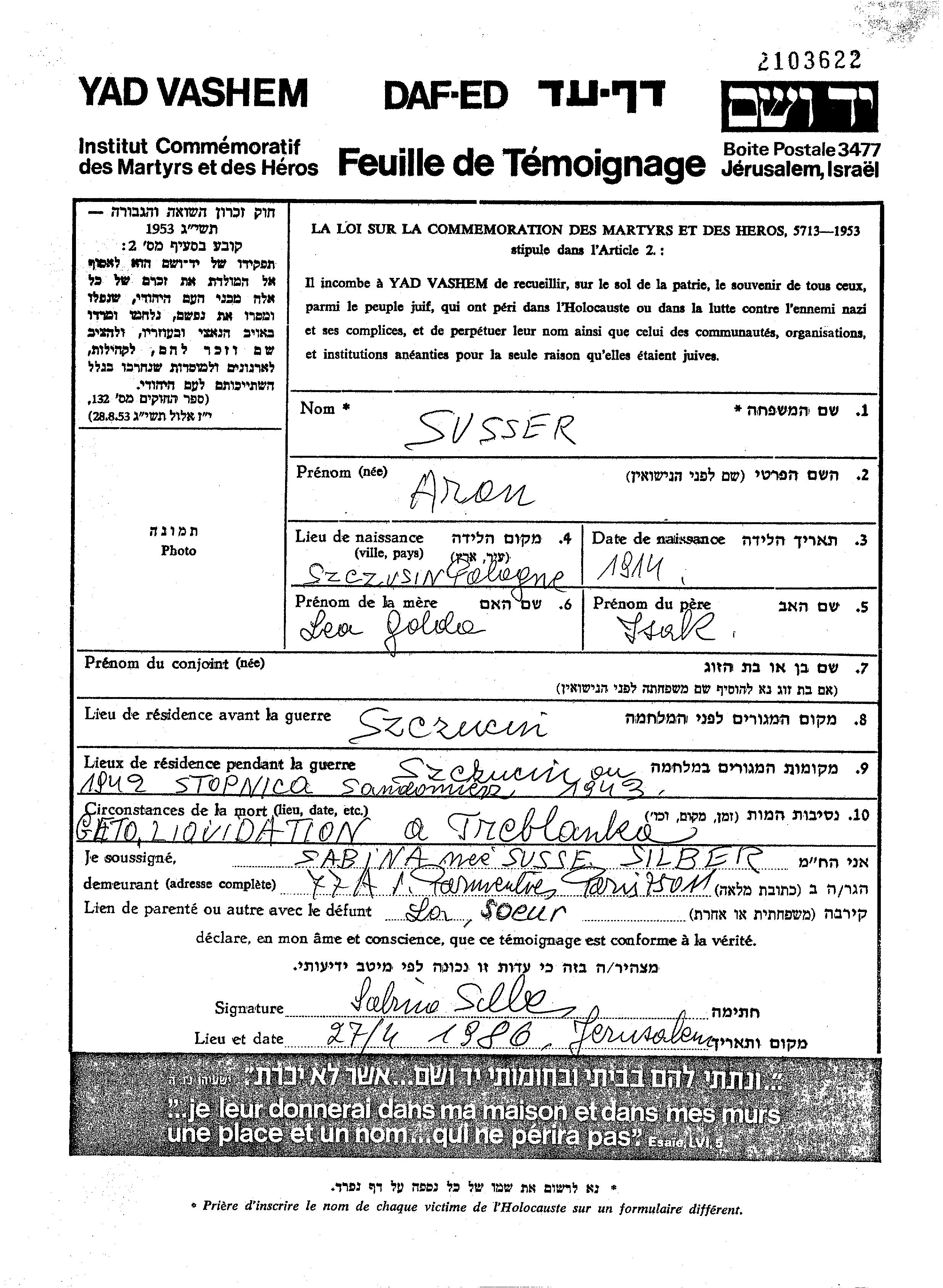 Susser Zuser Aron Szczucin, Pologne Feuille de témoignage