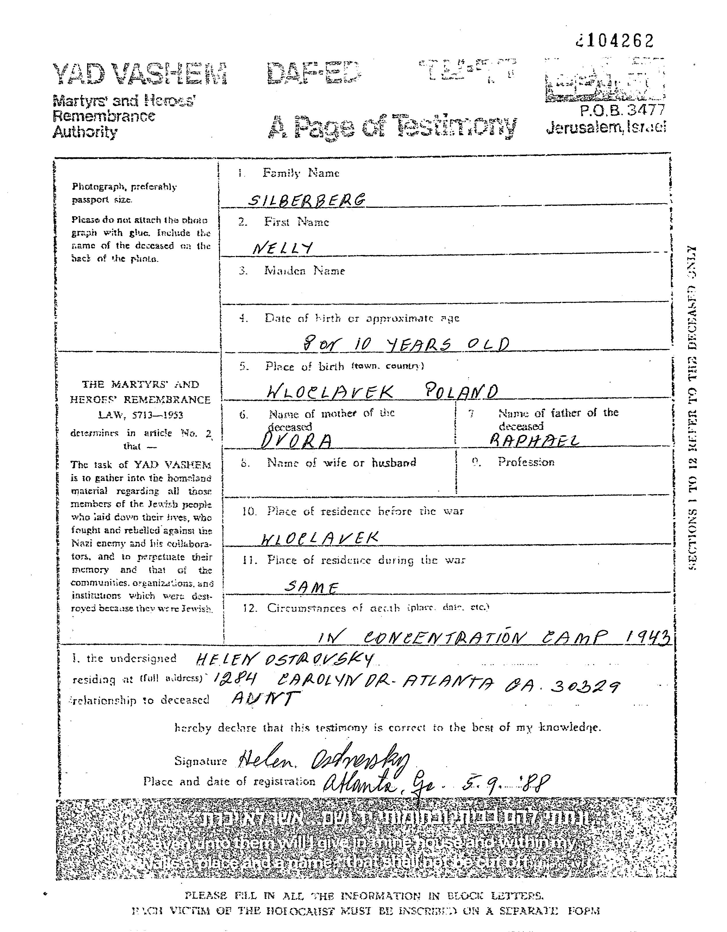 Silberberg Nelly Wloclawek, Pologne Feuille de témoignage