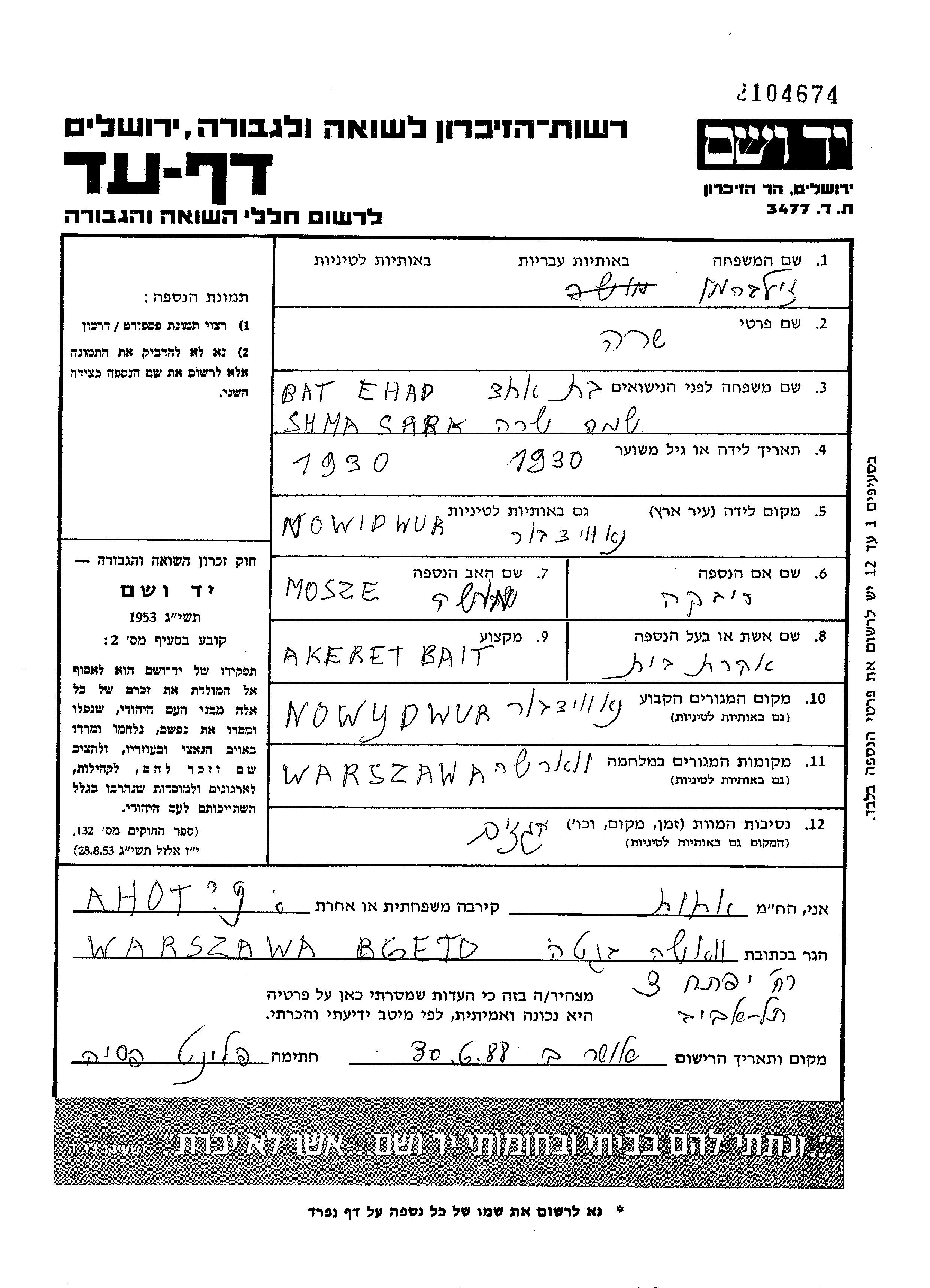 Zilberman Sara 1930 Nowy Dwor Mazowiecki, Pologne Feuille de témoignage