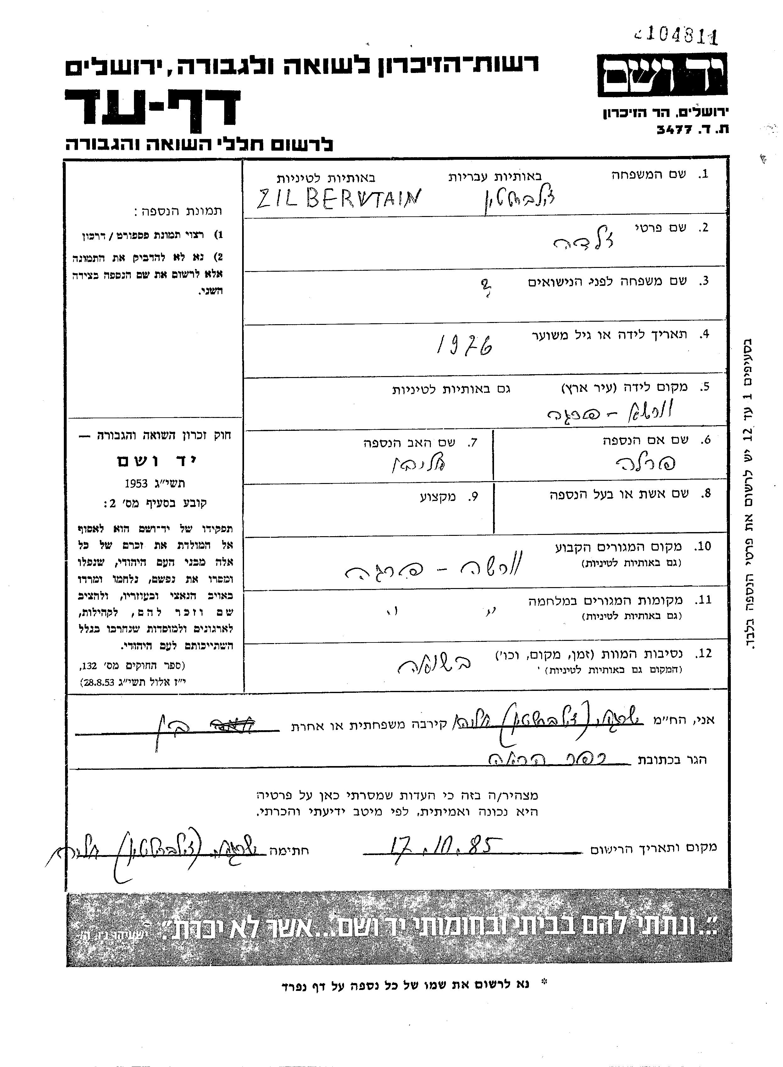 Yad Vashem - Pages of Testimony Names Memorial Collection