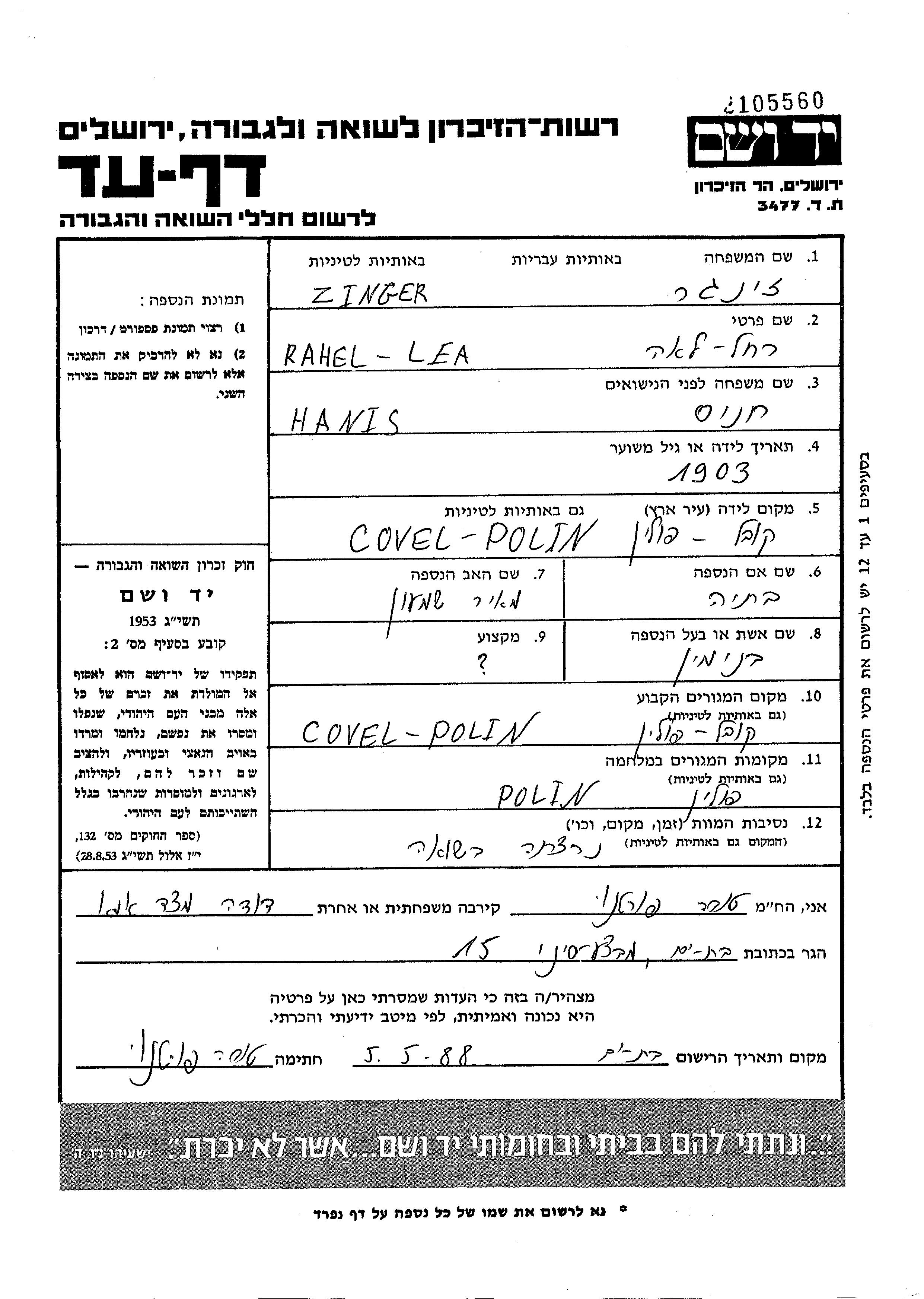 Zinger Rahel Lea 1903 Kowel, Pologne Feuille de témoignage