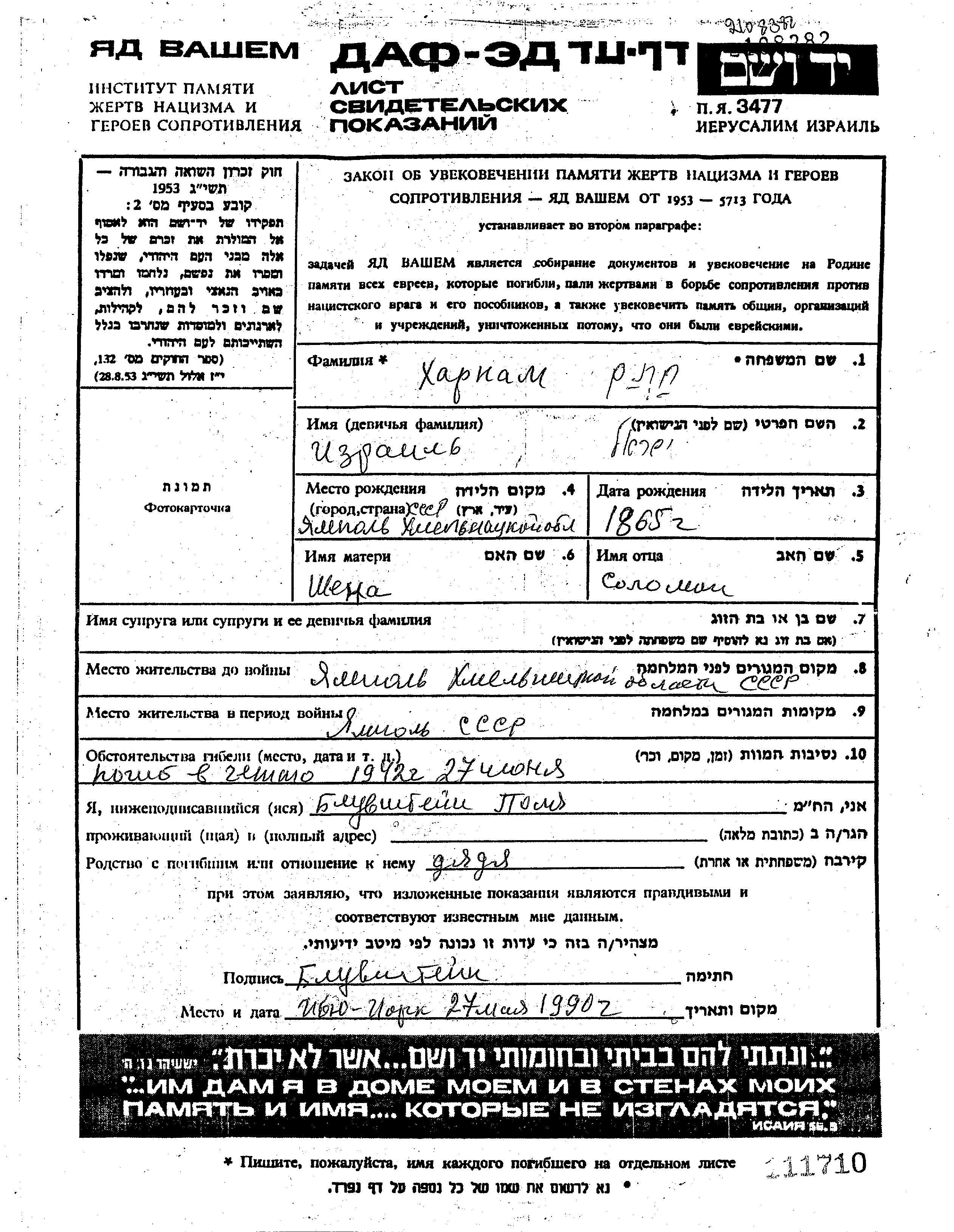 Kharnam Izrail Yampol, Ukraine (URSS) Feuille de témoignage