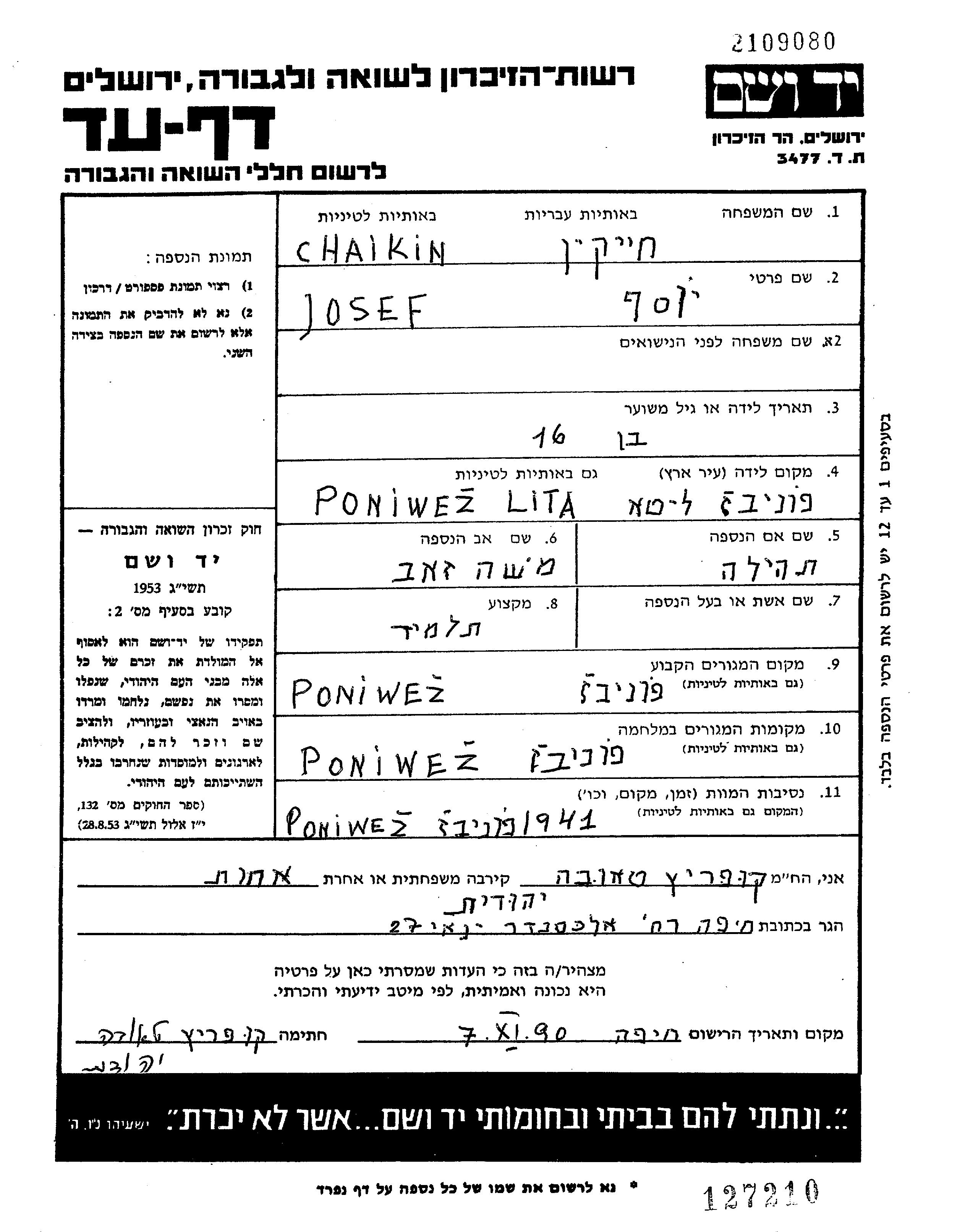 Chaikin Khaikin Josef 1925 Ponivez, Lituanie Feuille de témoignage