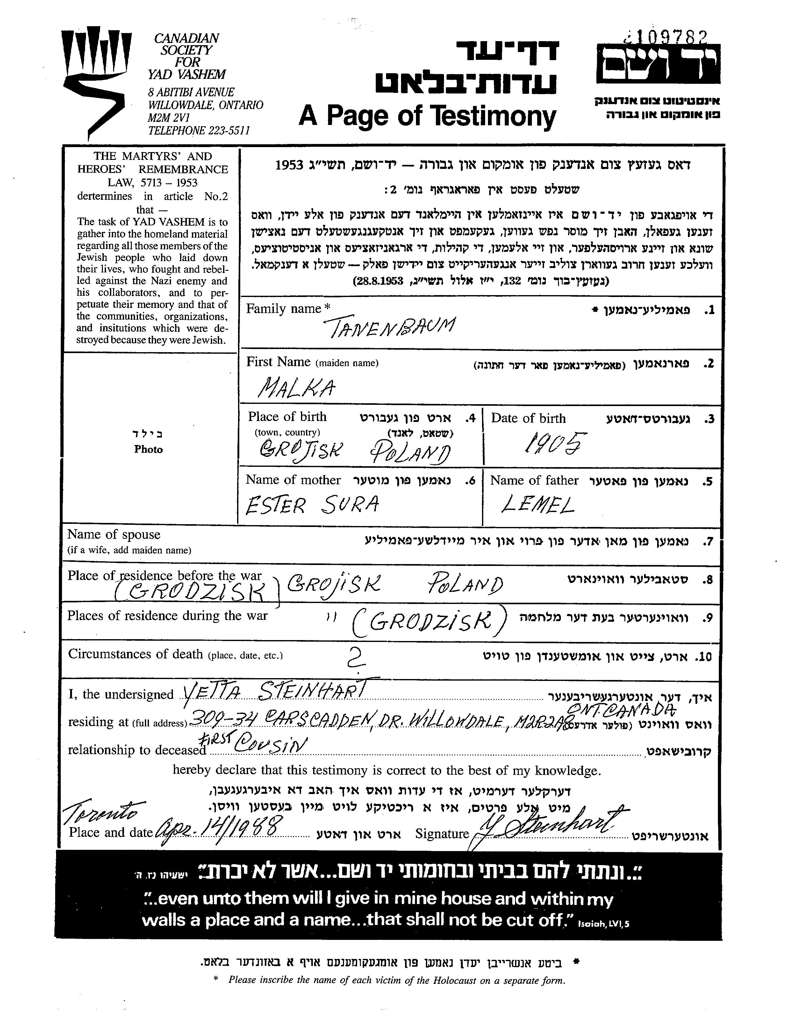 Malka Tanenbaum est née à Grodzisk, Pologne en 1905, fille de Lemel et de Sura Ester née Plaun. Avant la seconde guerre mondiale elle vivait à Grodzisk, Pologne. Pendant la guerre, elle était à Grodzisk, Pologne.