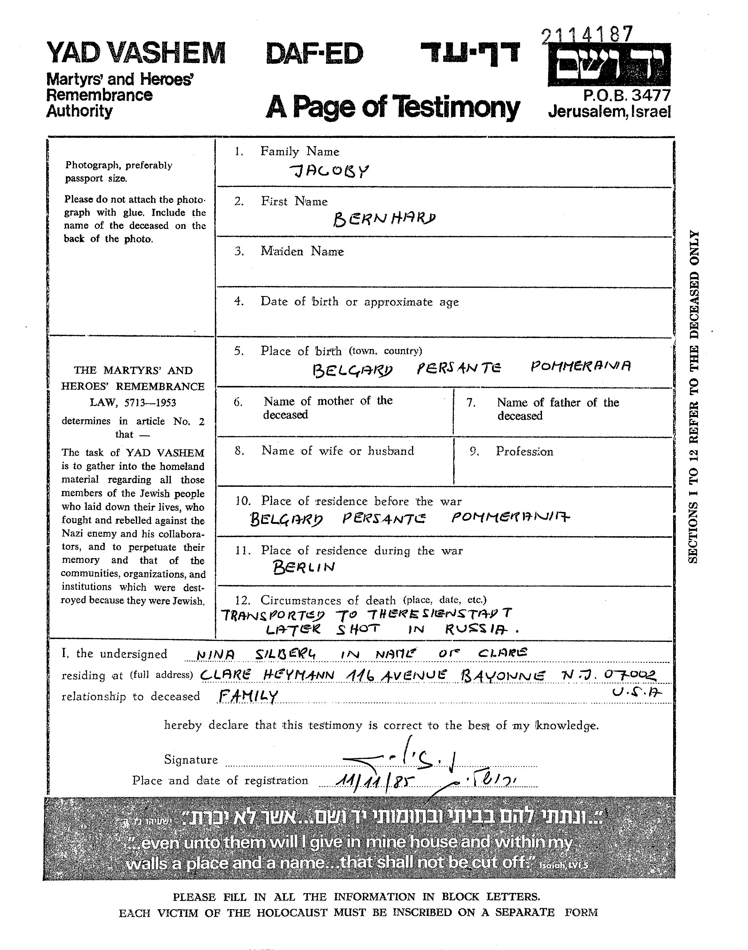 Bernhard Jacoby est né à Belgard, Allemagne. Avant la seconde guerre mondiale il vivait à Belgard, Allemagne. Au cours de la guerre, il était à Berlin, Allemagne.