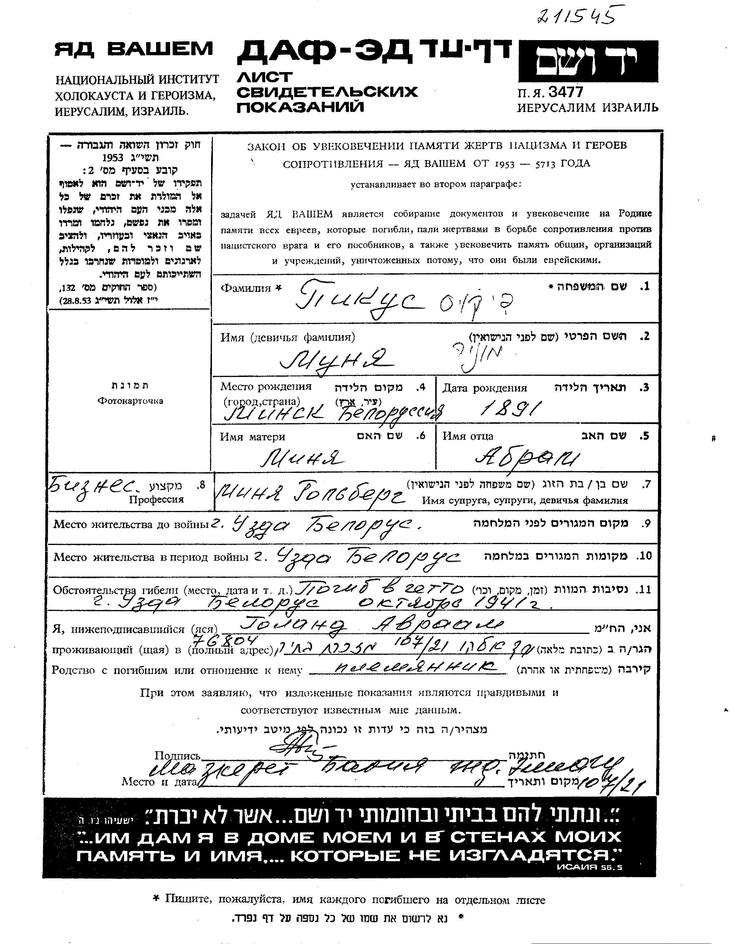 Pikus Monia 1891 Uzda, Bélorussie (URSS) Feuille de témoignage