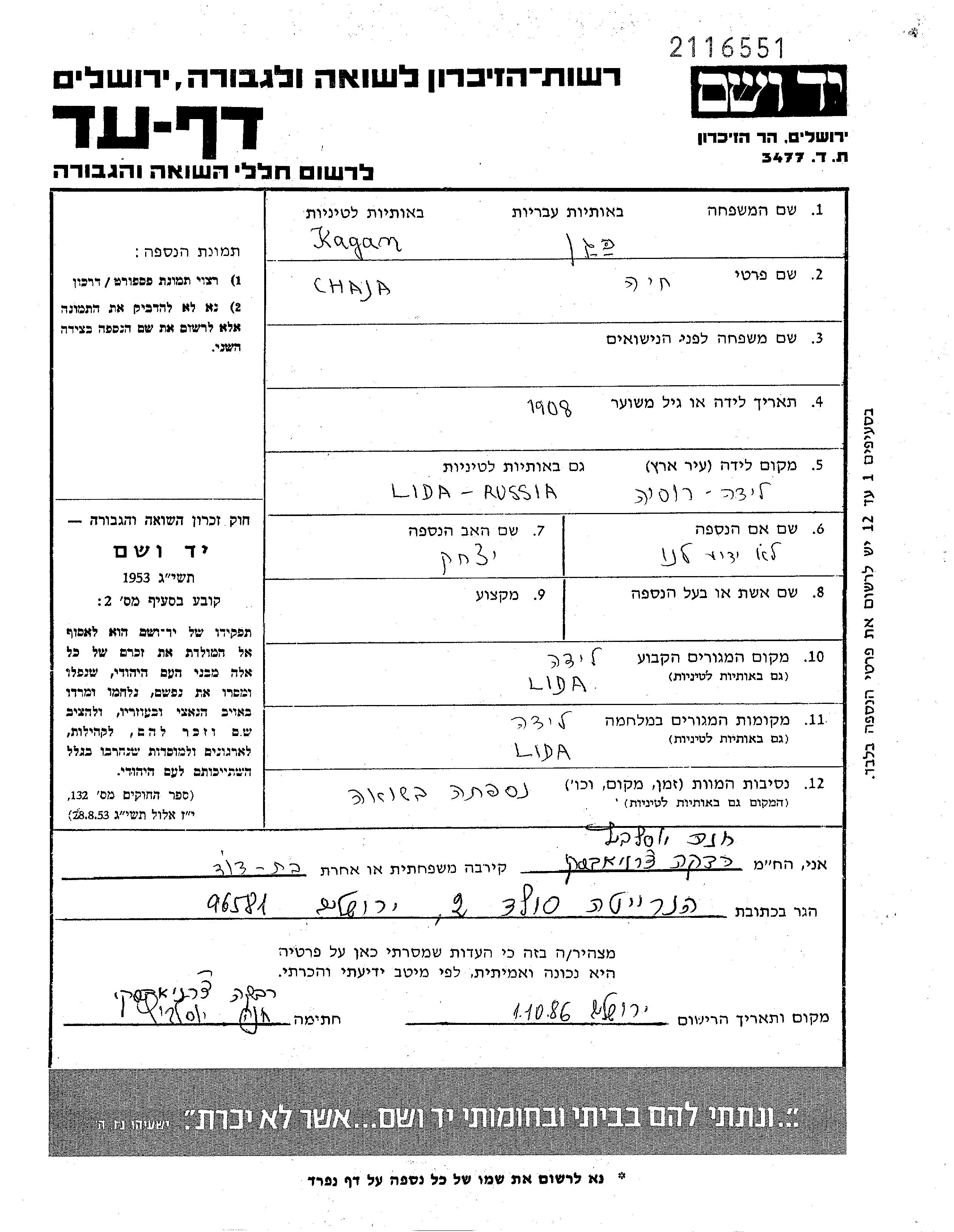 Kagan Chaja 1908 Lida, Pologne Feuille de témoignage
