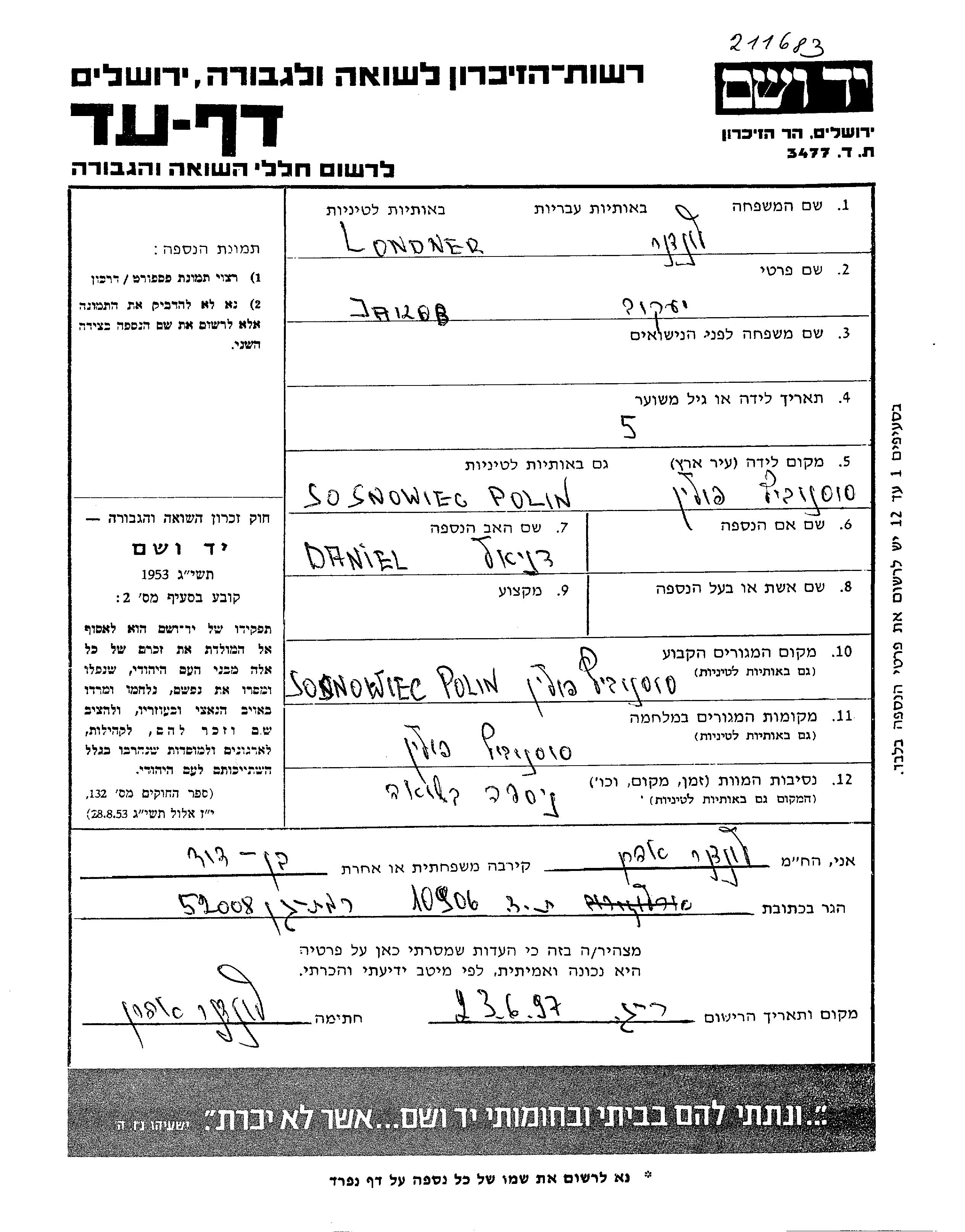 Londner Jakob Sosnowiec, Pologne Feuille de témoignage