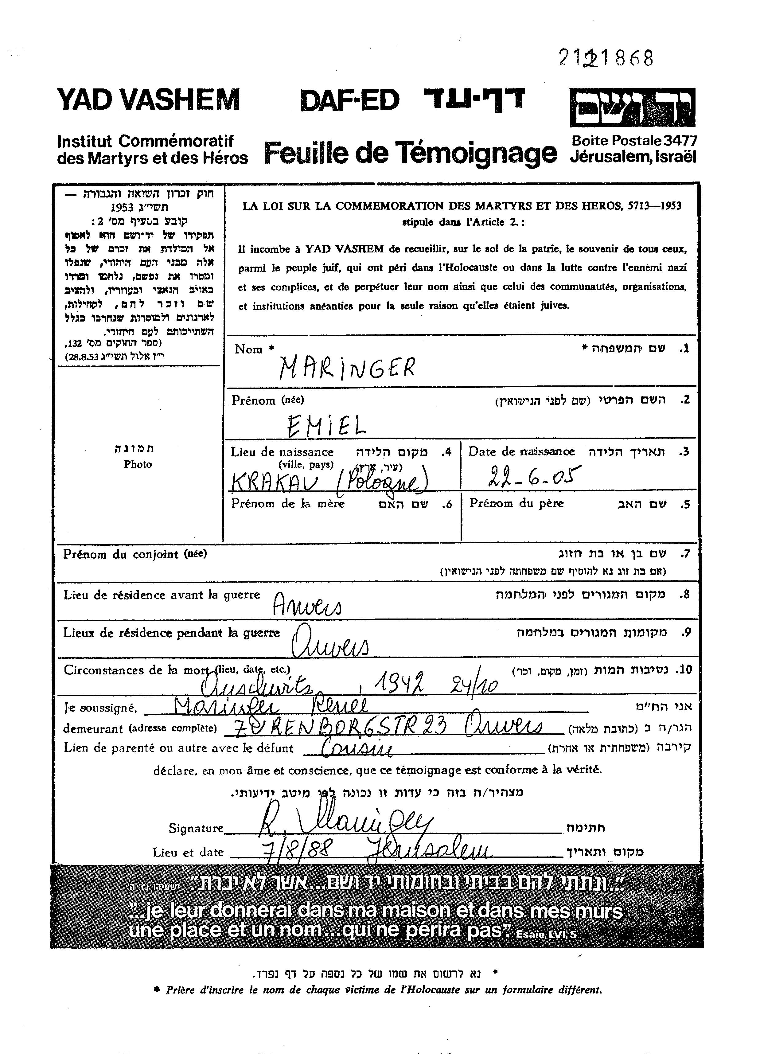 Maringer Emiel 1905 Anvers, Belgique Feuille de témoignage