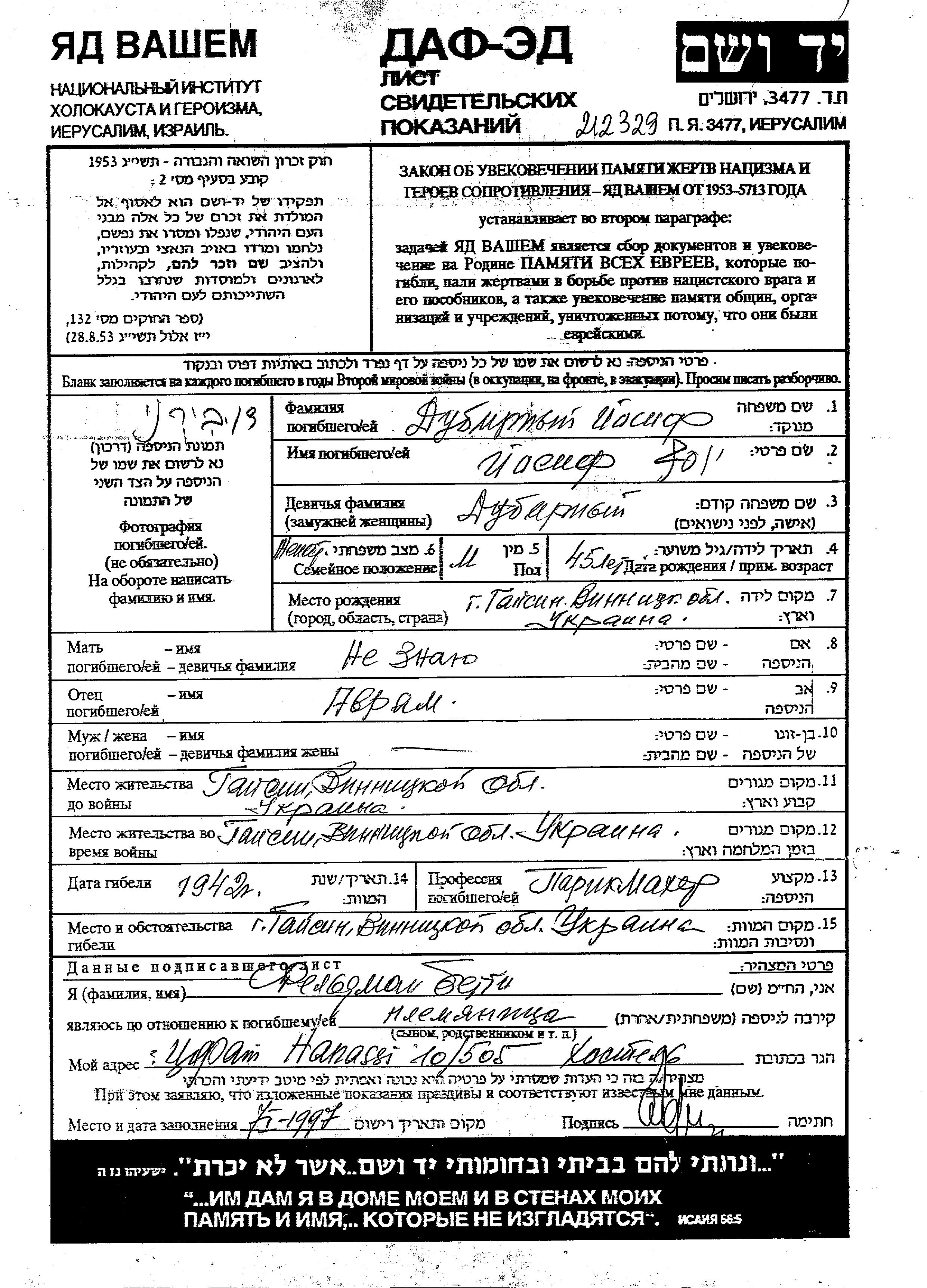 Dubirny Yosif 1897 Gaysin, Ukraine (URSS) Feuille de témoignage