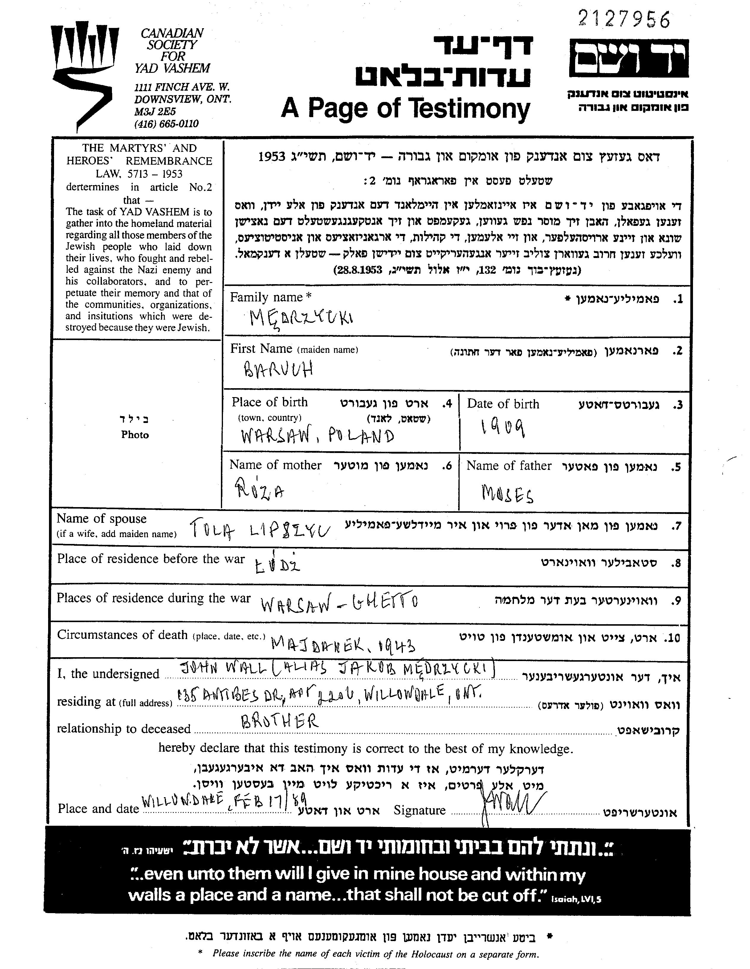 Baruch Medrzycki est né à Warszawa, Pologne en 1909, fils de Moses et de Rozalia née Slomnicki. Il était Mariée à Tola. Avant la seconde guerre mondiale il vivait à Czestochowa, Pologne. Au cours de la guerre, il était à Warszawa, Pologne.