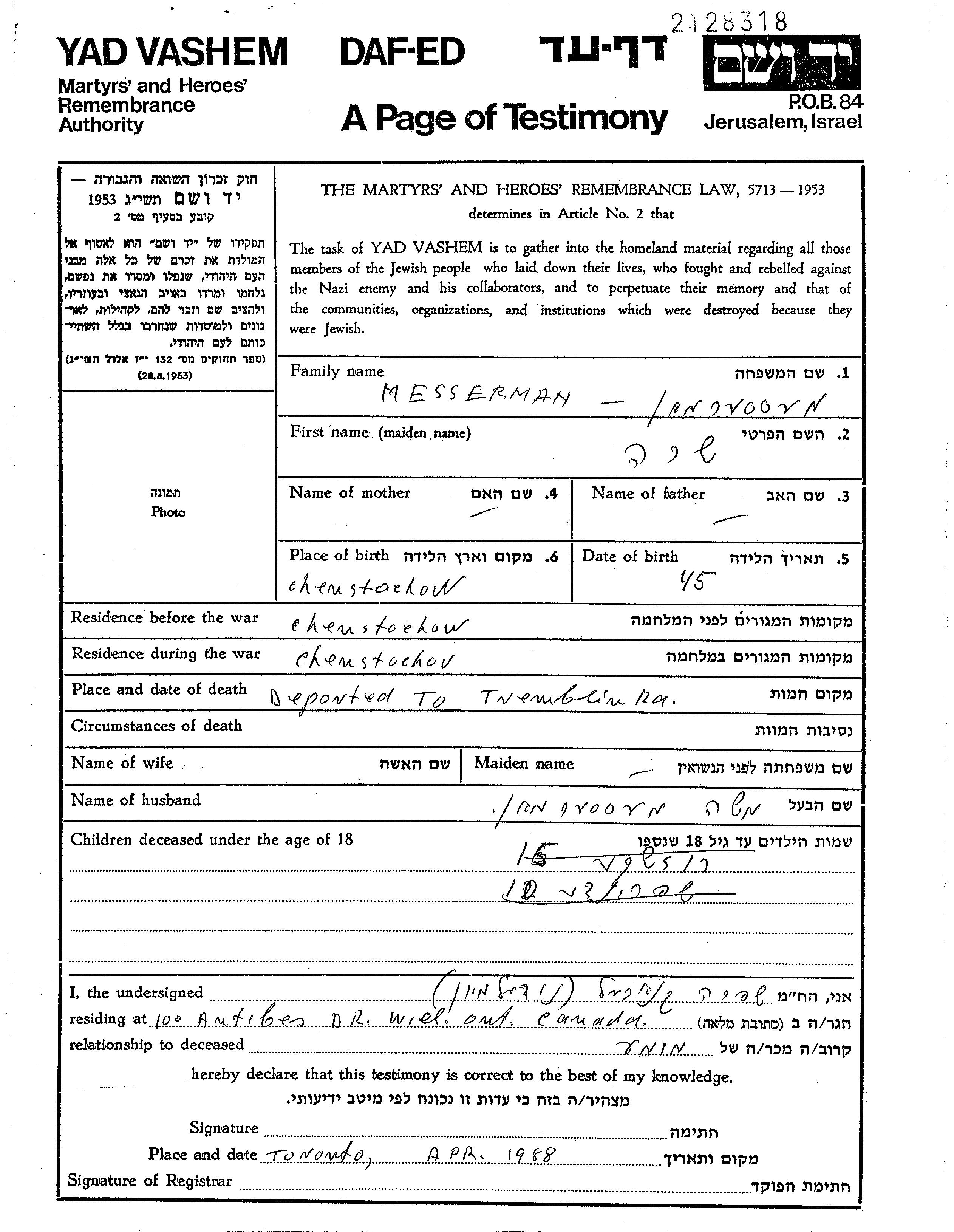 Messerman Sara Czestochowa, Pologne Feuille de témoignage