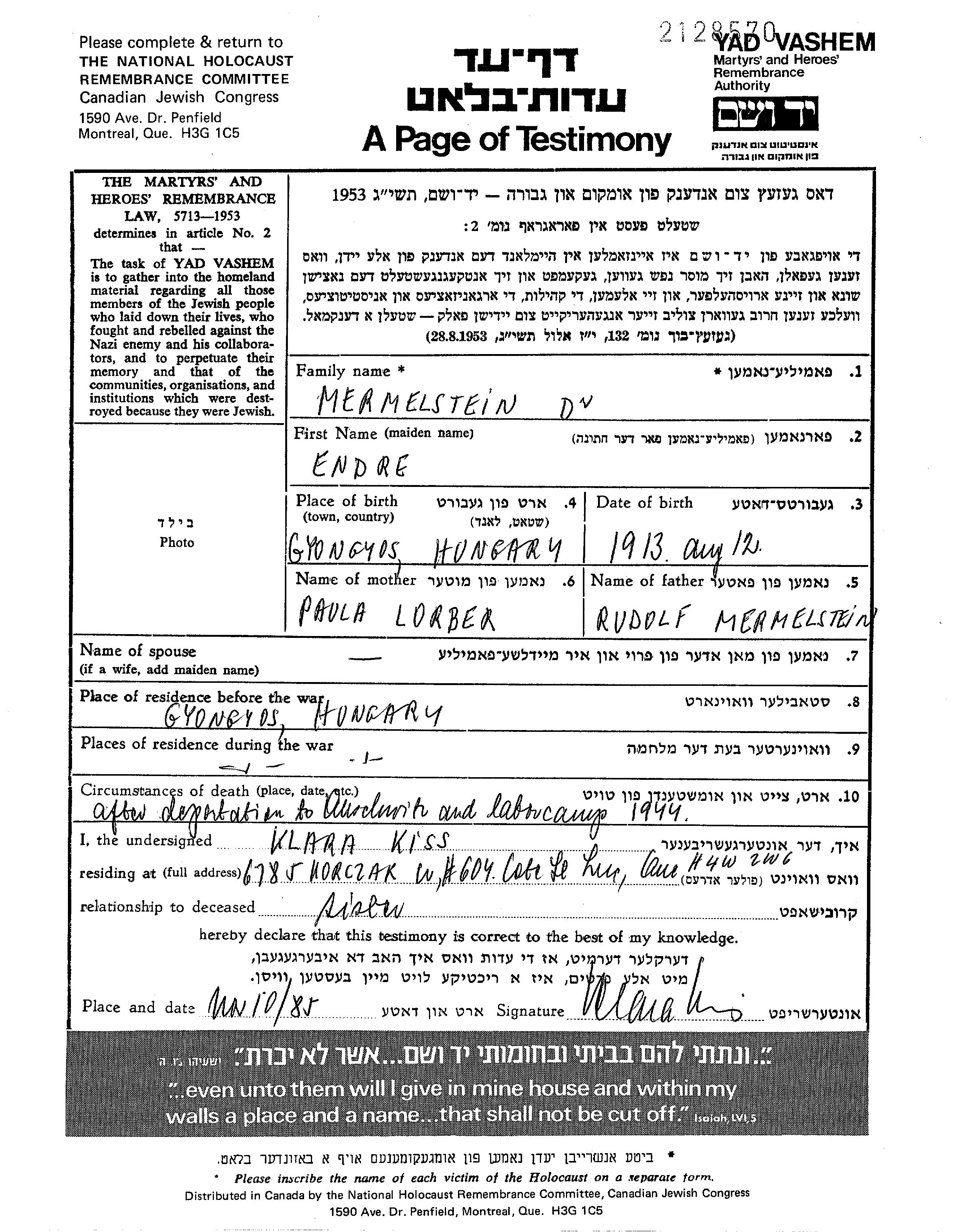 Mermelstein Andree 1913 Gyongyos, Hongrie Feuille de témoignage