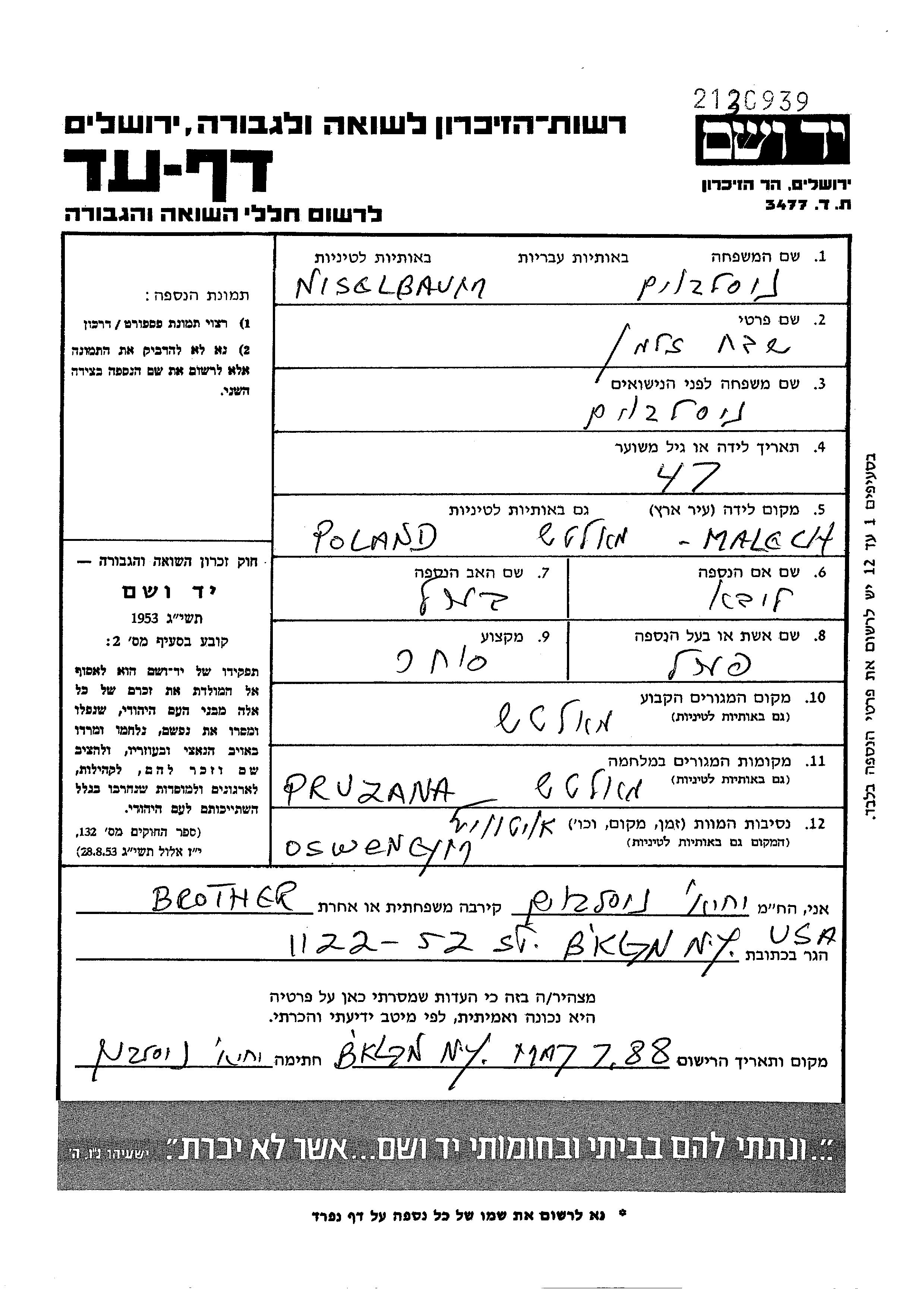 Zalman Shevakh Niselbaum est né à Malecz, Pologne, fils de Berl et de Liba née Kantorowitz. Il était Commerçant/e et Mariée à Perl. Avant la seconde guerre mondiale il vivait à Malecz, Pologne. Au cours de la guerre, il était à Pruzana, Pologne.
