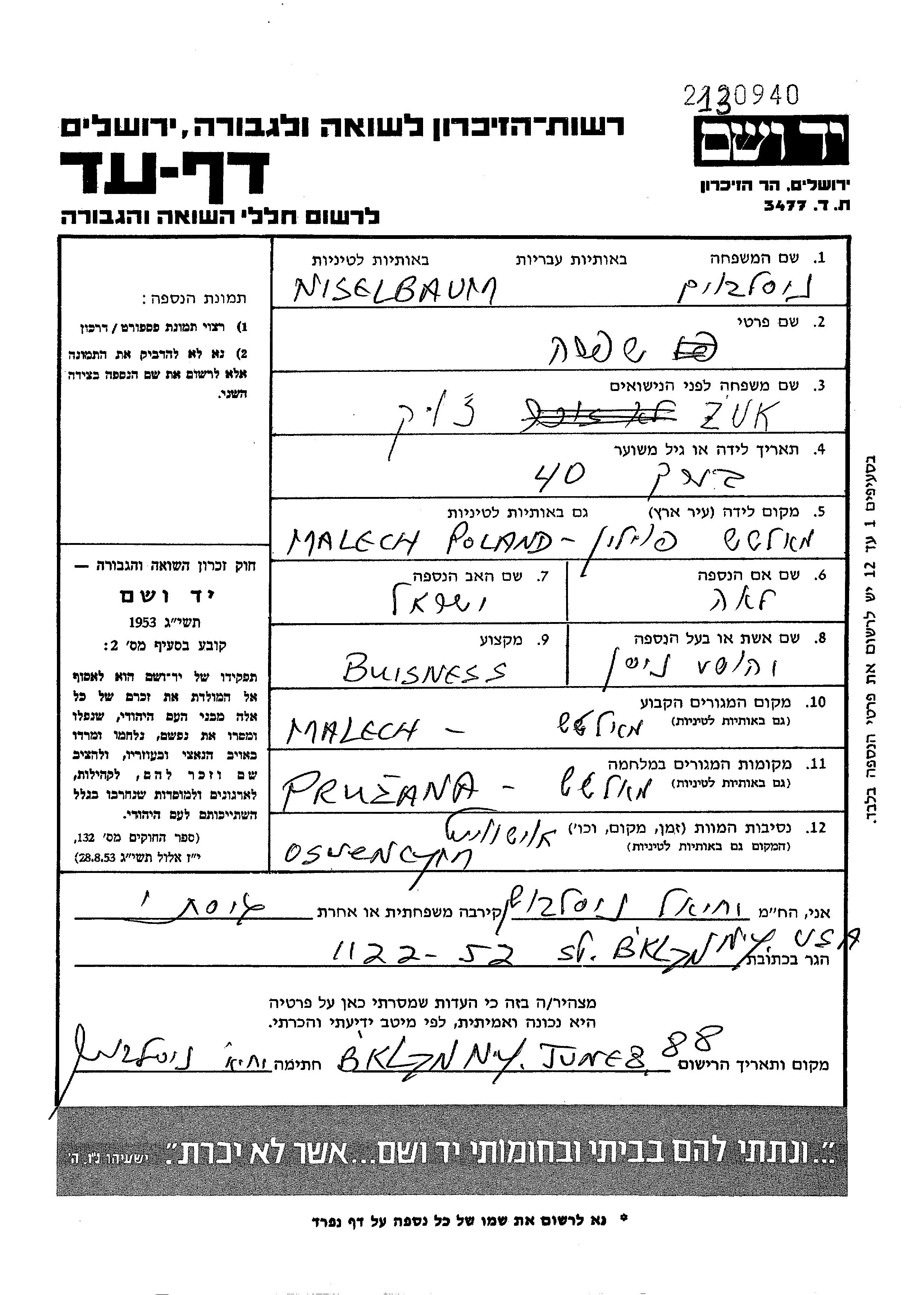 Niselbaum Shifra Malecz, Pologne Feuille de témoignage