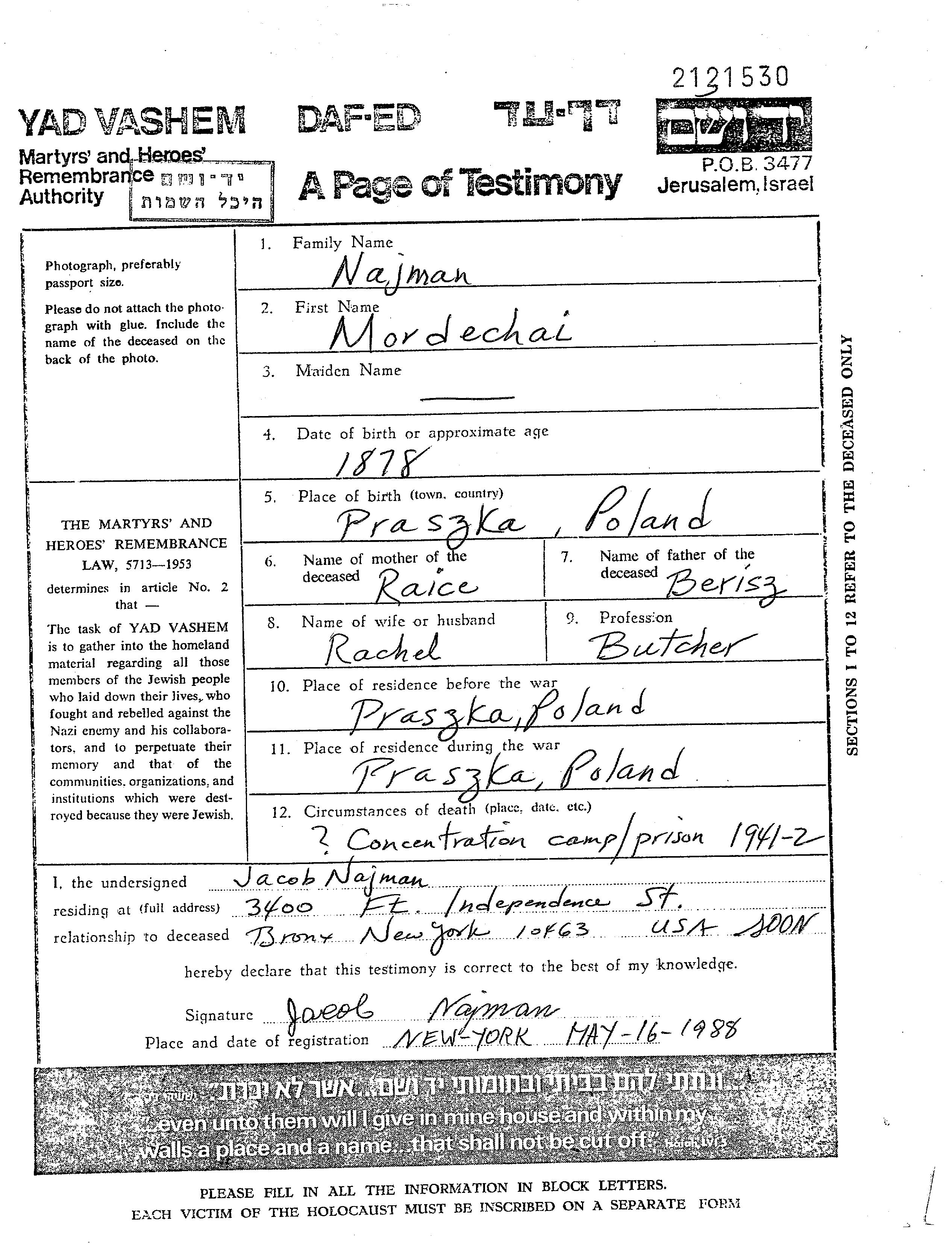 Mordechai Najman est né à Praszka, Pologne en 1878, fils de Berisz et de Raice. Il était Boucher et Mariée à Rachel. Avant la seconde guerre mondiale il vivait à Praszka, Pologne. Au cours de la guerre, il était à Praszka, Pologne.