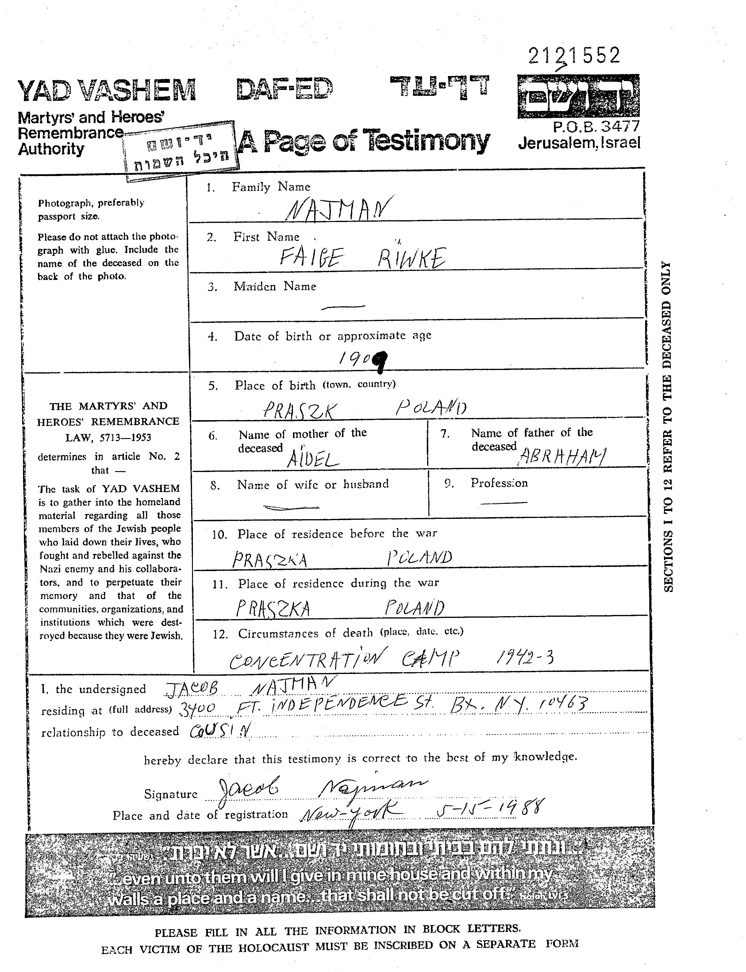 Najman Faige Riwke 1909 Praszka, Pologne Feuille de témoignage