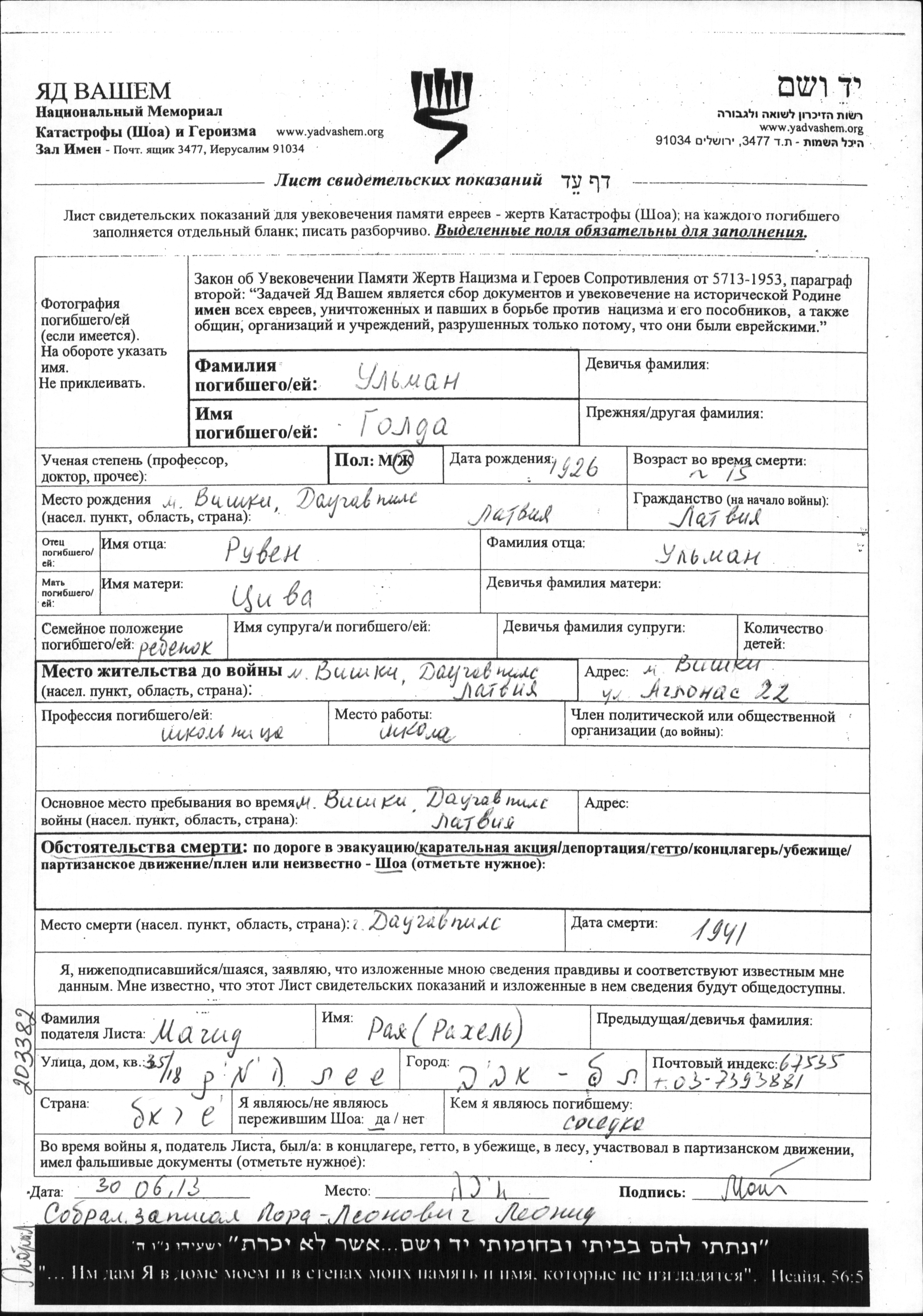 Yad Vashem - Pages of Testimony Names Memorial Collection