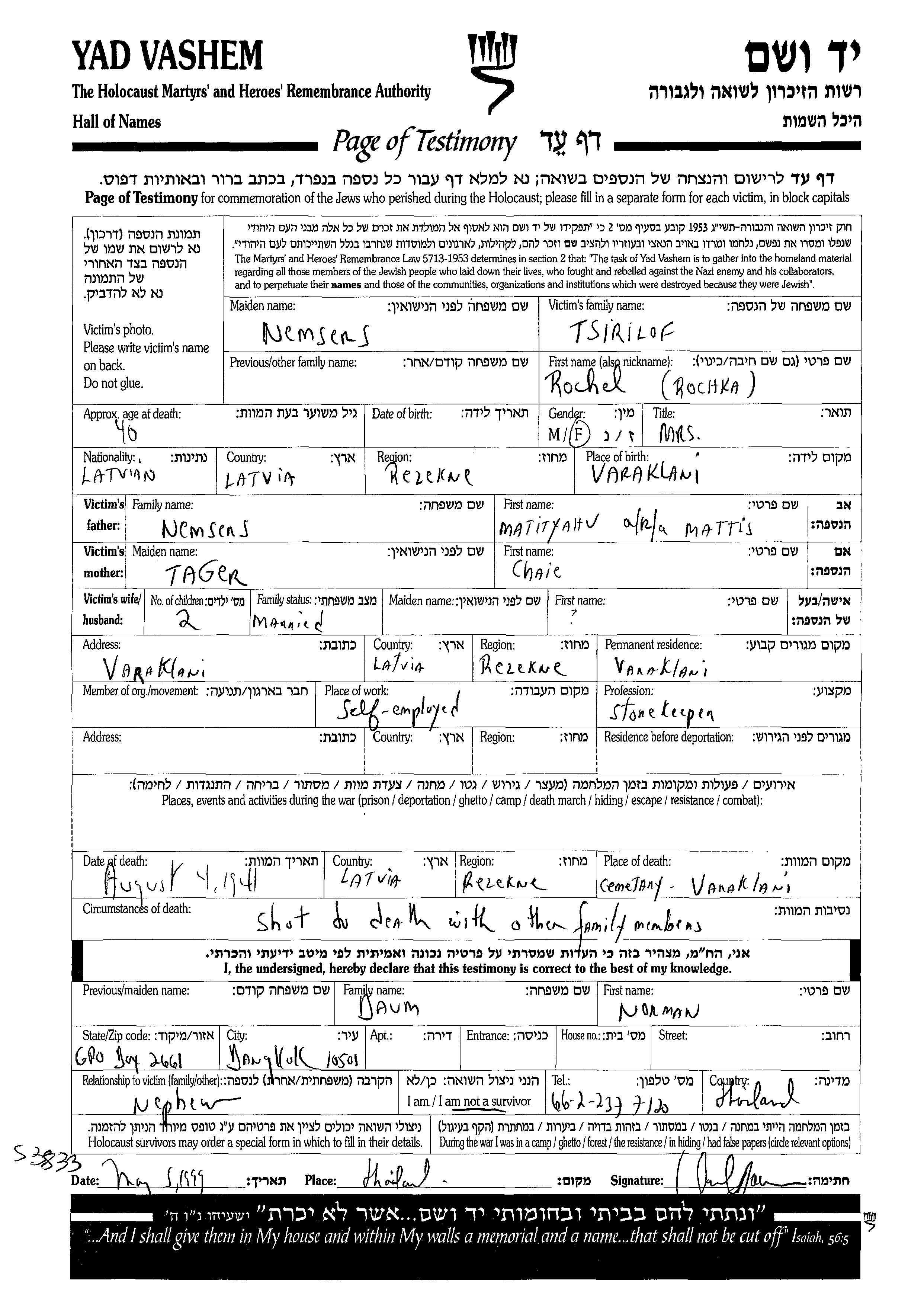 Tsirilof Rochel Varaklani, Lettonie Feuille de témoignage