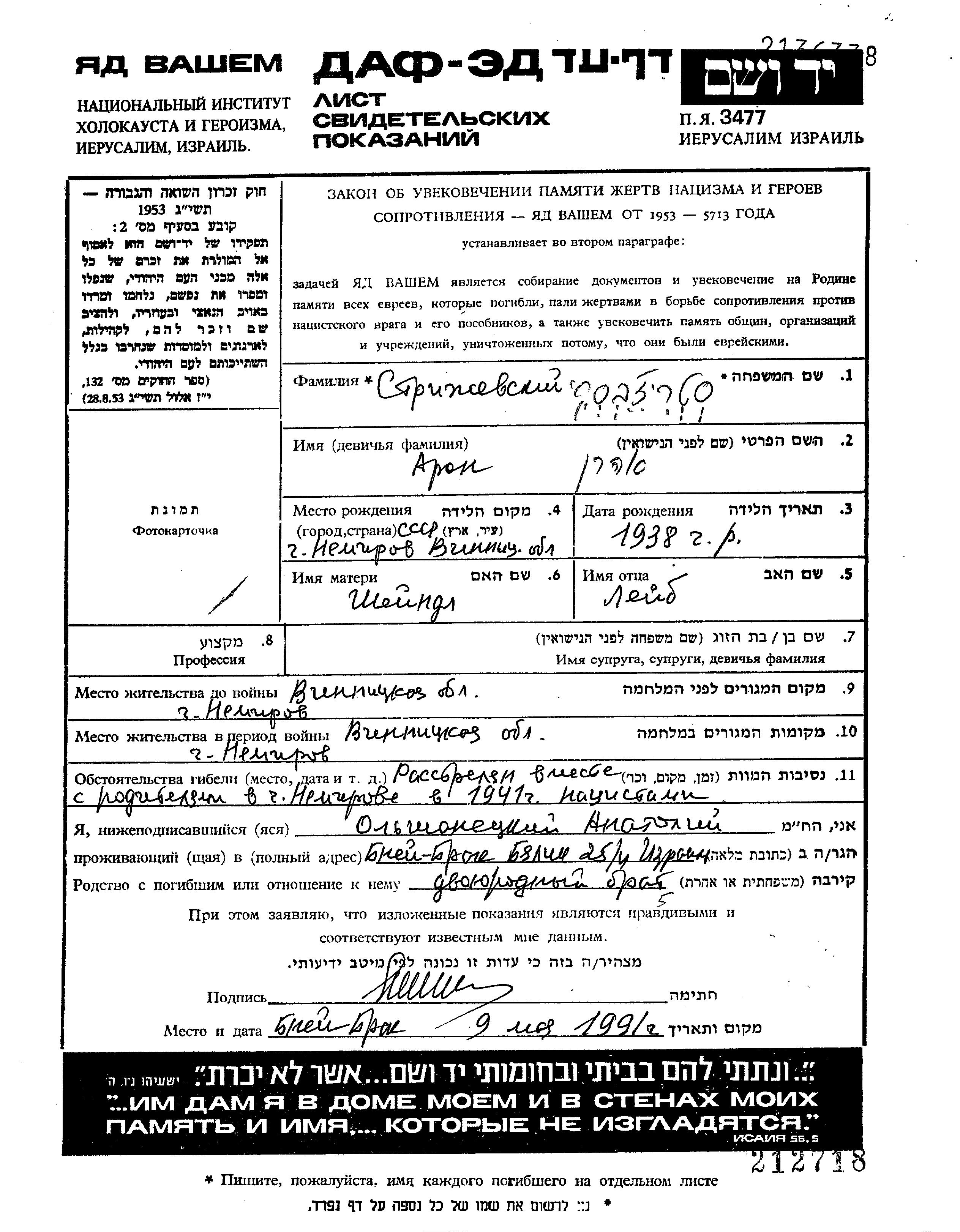 Strizhevski Aron 1938 Nemirov, Ukraine (URSS) Feuille de témoignage