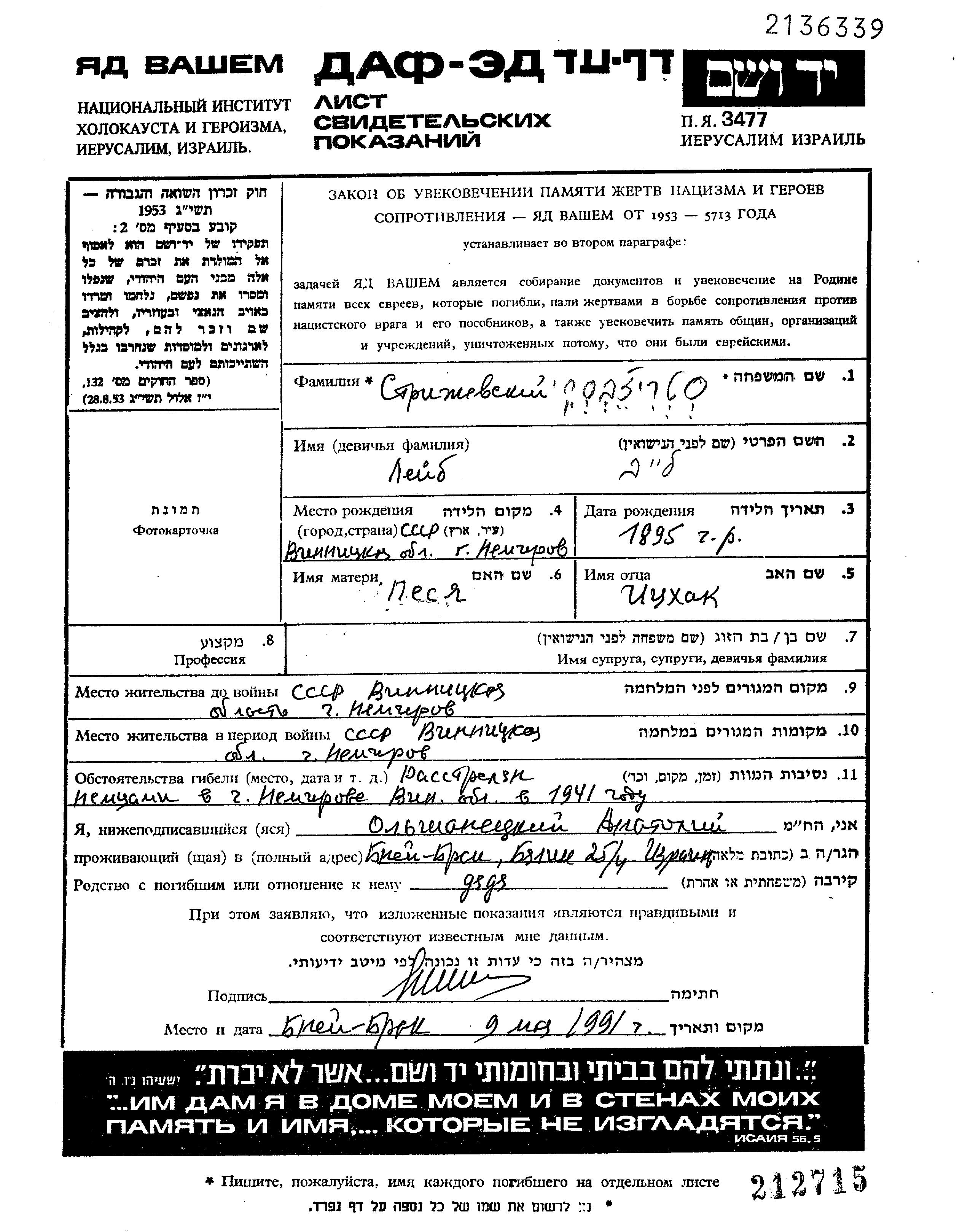 Strizhevski Leib 1895 Nemirov, Ukraine (URSS) Feuille de témoignage