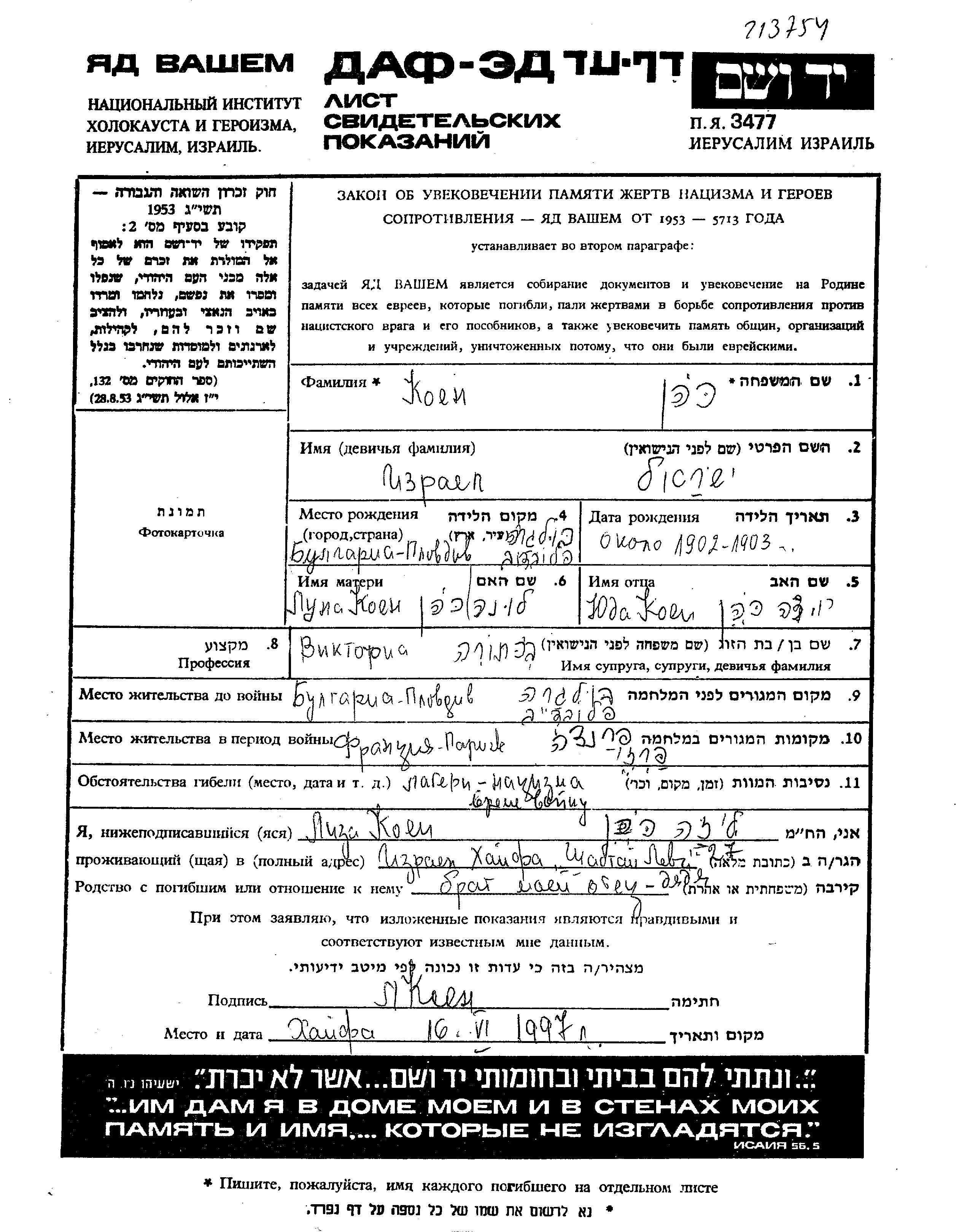 Koen Izrael 1902 Plovdiv, Bulgarie Feuille de témoignage