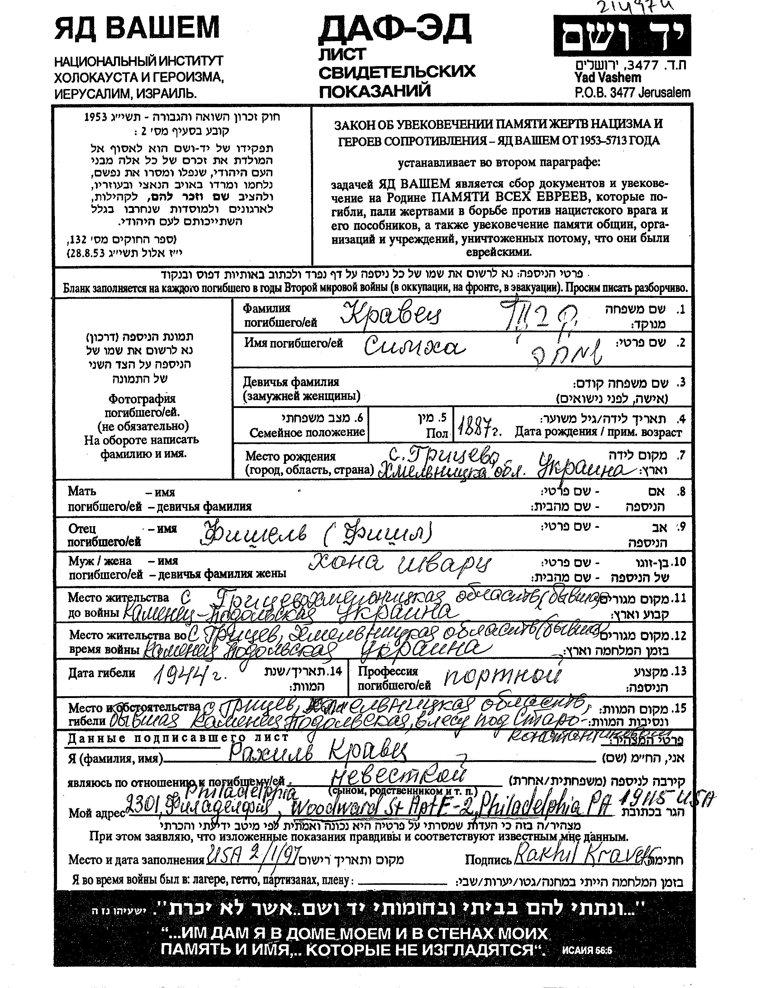 Kravitz prénom inconnu 1887 Gritsev, Ukraine (URSS) Feuille de témoignage