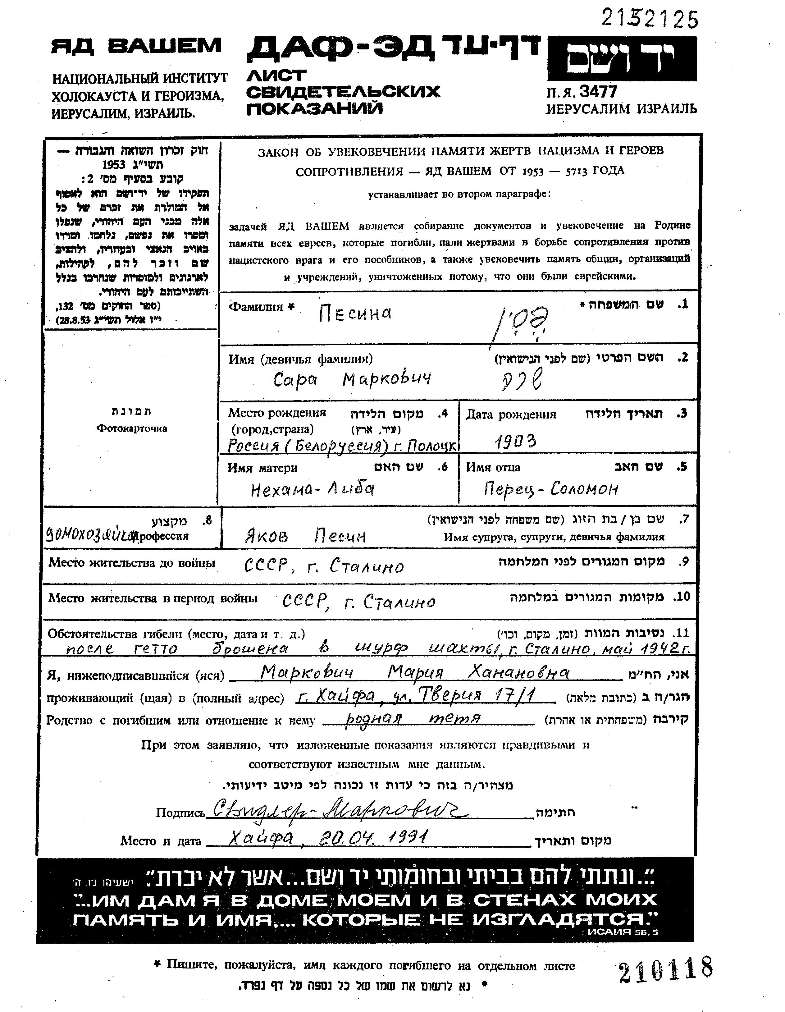 Pesin Sara 1903 Stalino, Ukraine (URSS) Feuille de témoignage