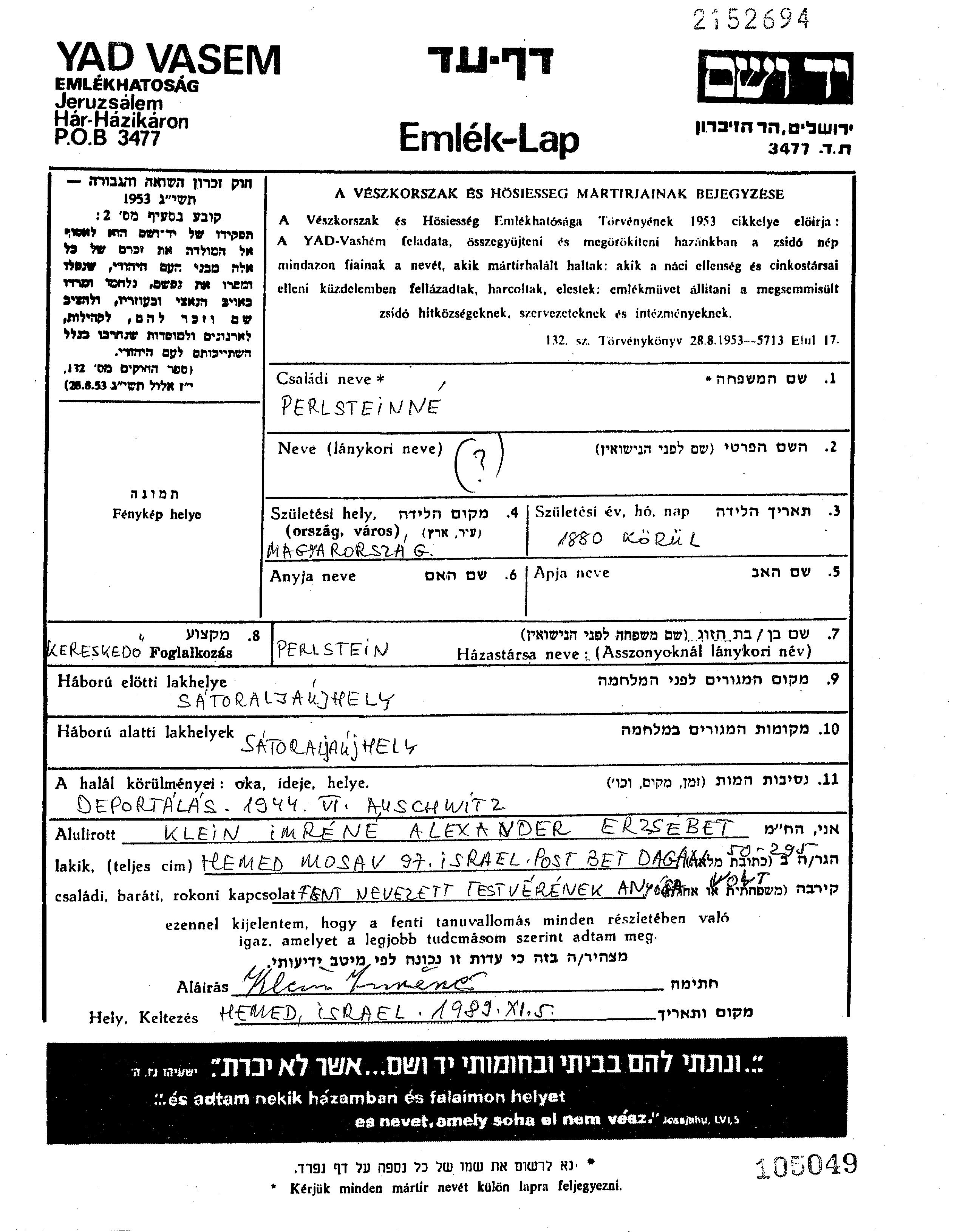 Perlstein prénom inconnu 1880 Satoraljaujhely, Hongrie Feuille de témoignage