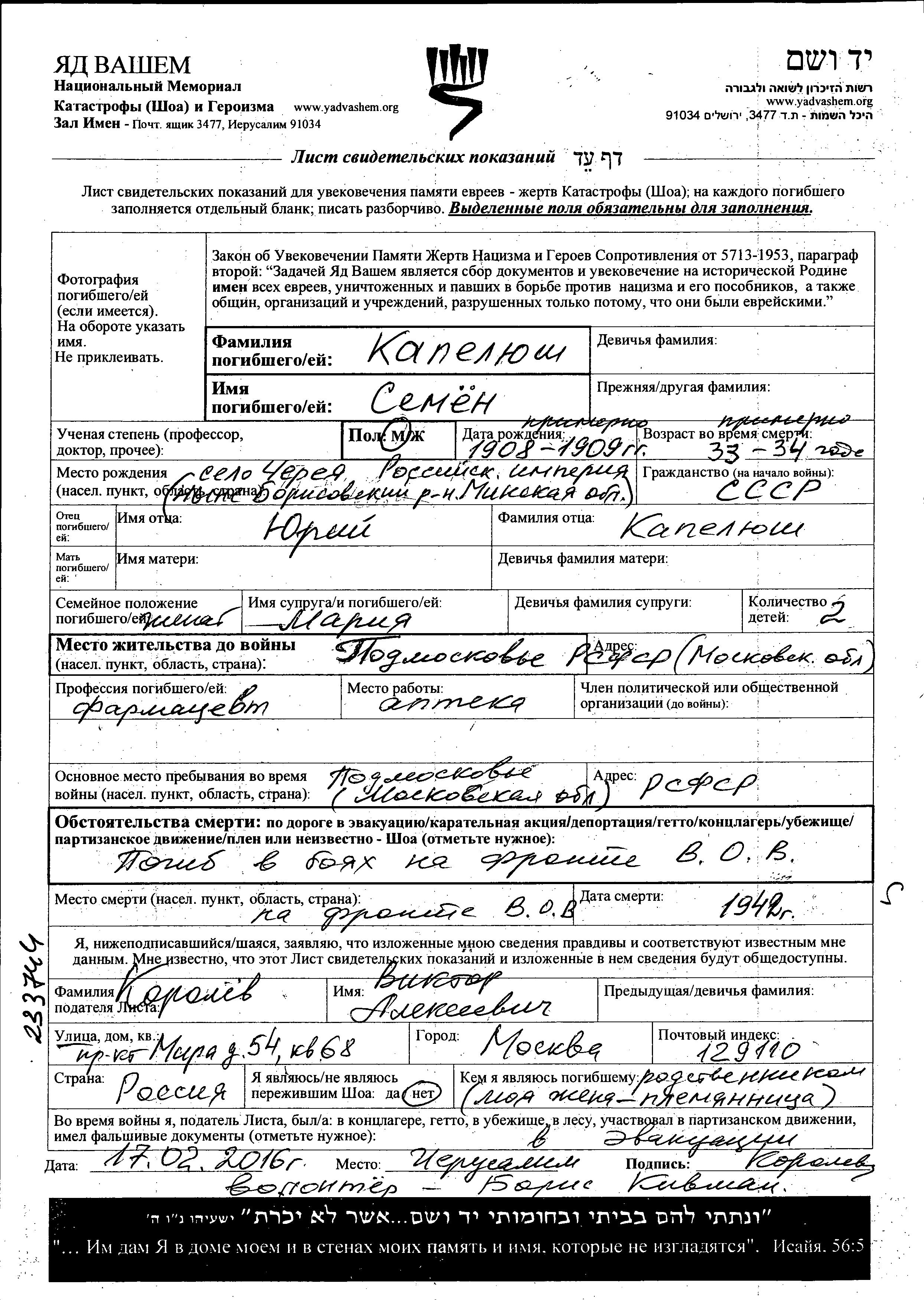 Semyon Kapelyush est né à Chereya, Bélorussie (URSS) en 1908, fils de Yuri. Il était Pharmacien/ne et Mariée à Maria. Avant la seconde guerre mondiale il vivait à Moskva City, Russie (URSS). Au cours de la guerre, il était à Moskva City, Russie (URSS).