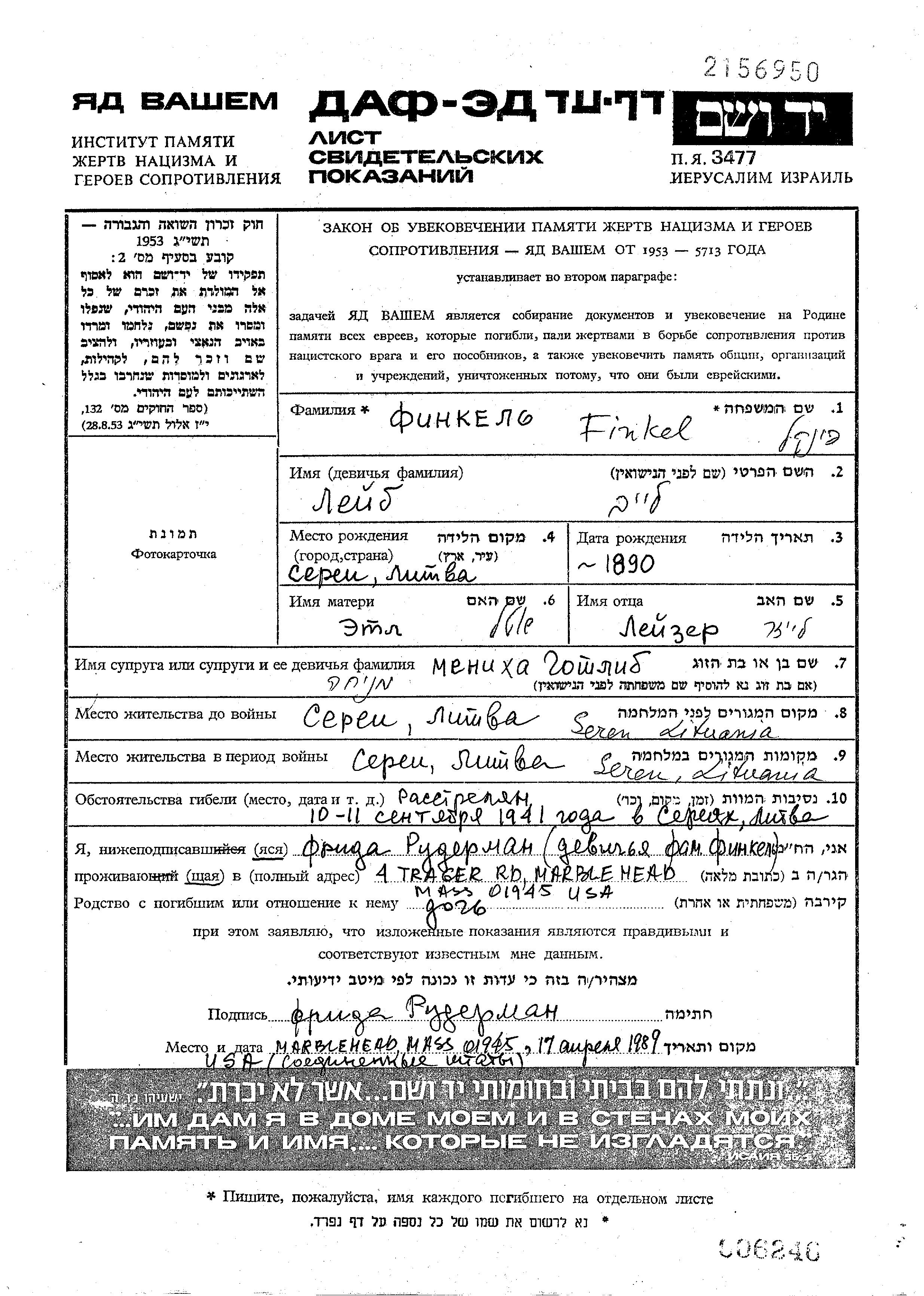 Finkel Leib 1890 Serey, Lituanie Feuille de témoignage