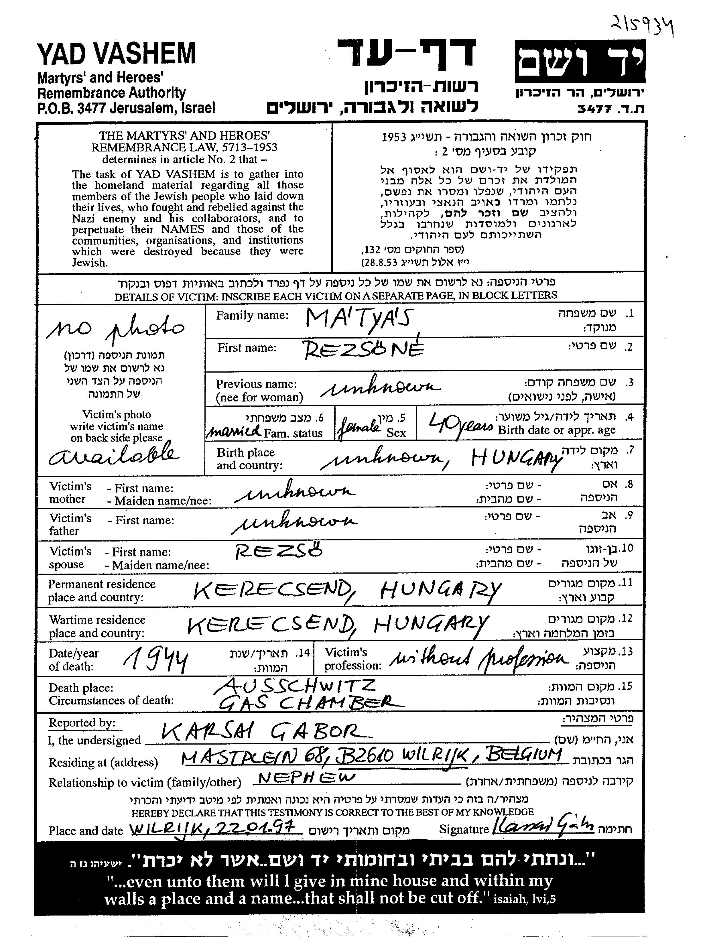 Matyas Manci Kerecsend, Hongrie Feuille de témoignage